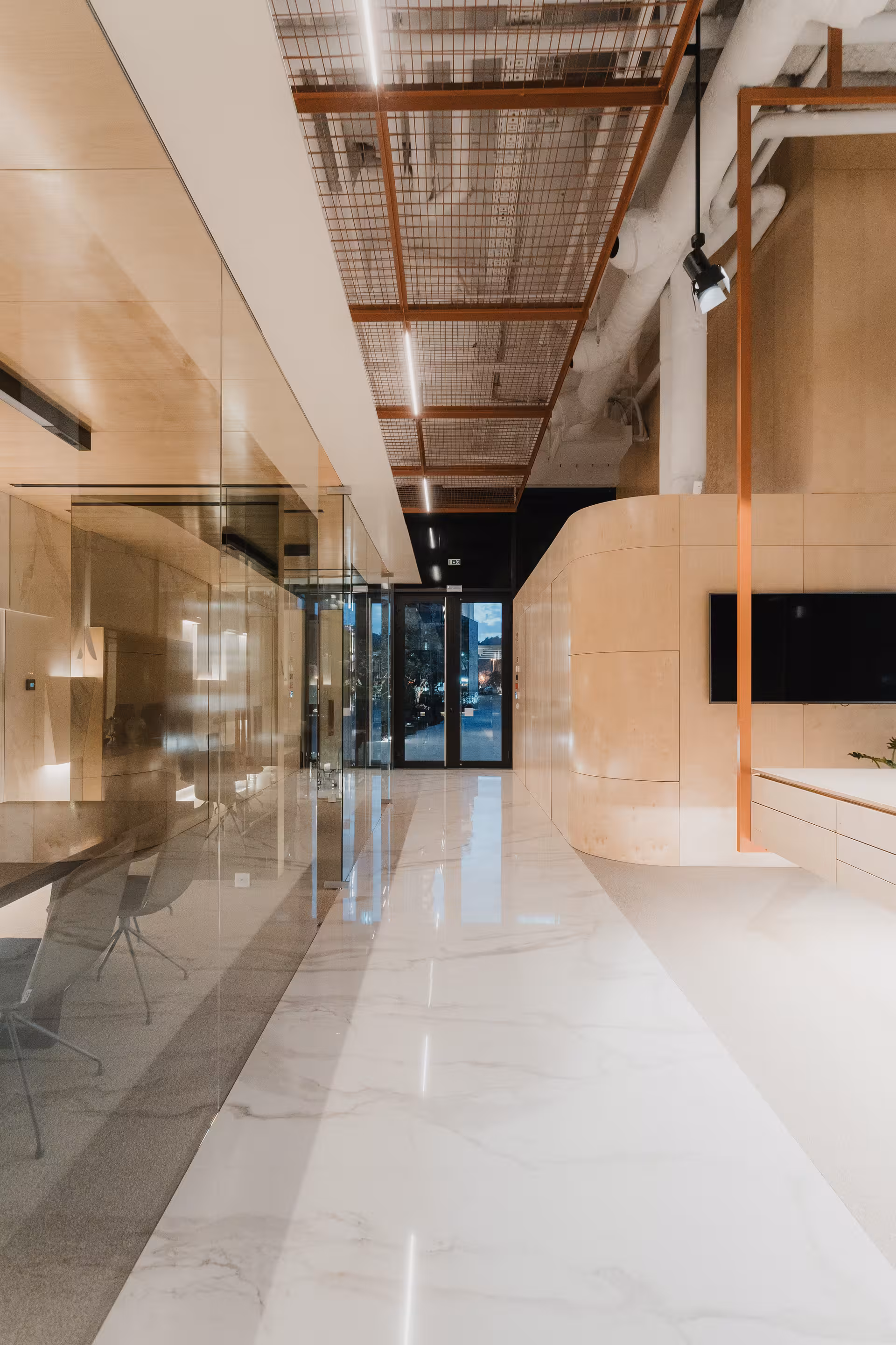 circulações de forma clara e intuitiva. O mobiliário, de linhas simples e proporções rigorosas, contribui para uma atmosfera serena e profissional, adequada à experiência do cliente e à apresentação do produto imobiliário.