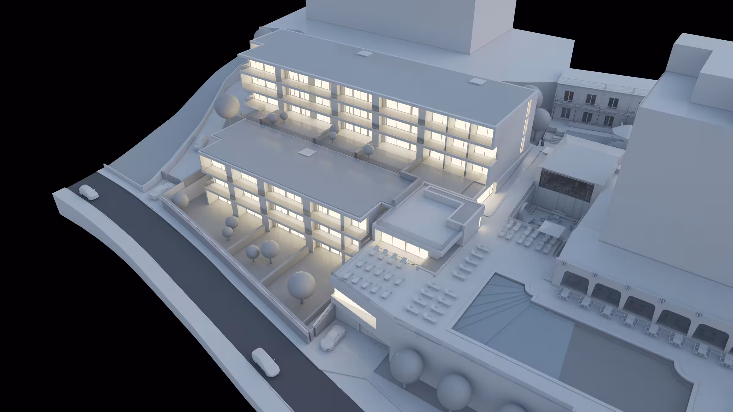 O Savoy Residence insere-se numa zona consolidada do Funchal, marcada por grande heterogeneidade tipológica e variações topográficas relevantes. A opção por dois blocos, em vez de um único volume, permite maior desafogo, melhor exposição solar e uma abertura mais generosa às vistas, criando ainda espaço para jardins comuns e pátios privativos. Uma sebe define uma transição suave entre a Rua João Paulo II e o edificado, reforçando a relação entre a vivência urbana e o espaço habitado, sobretudo nas unidades do piso térreo.