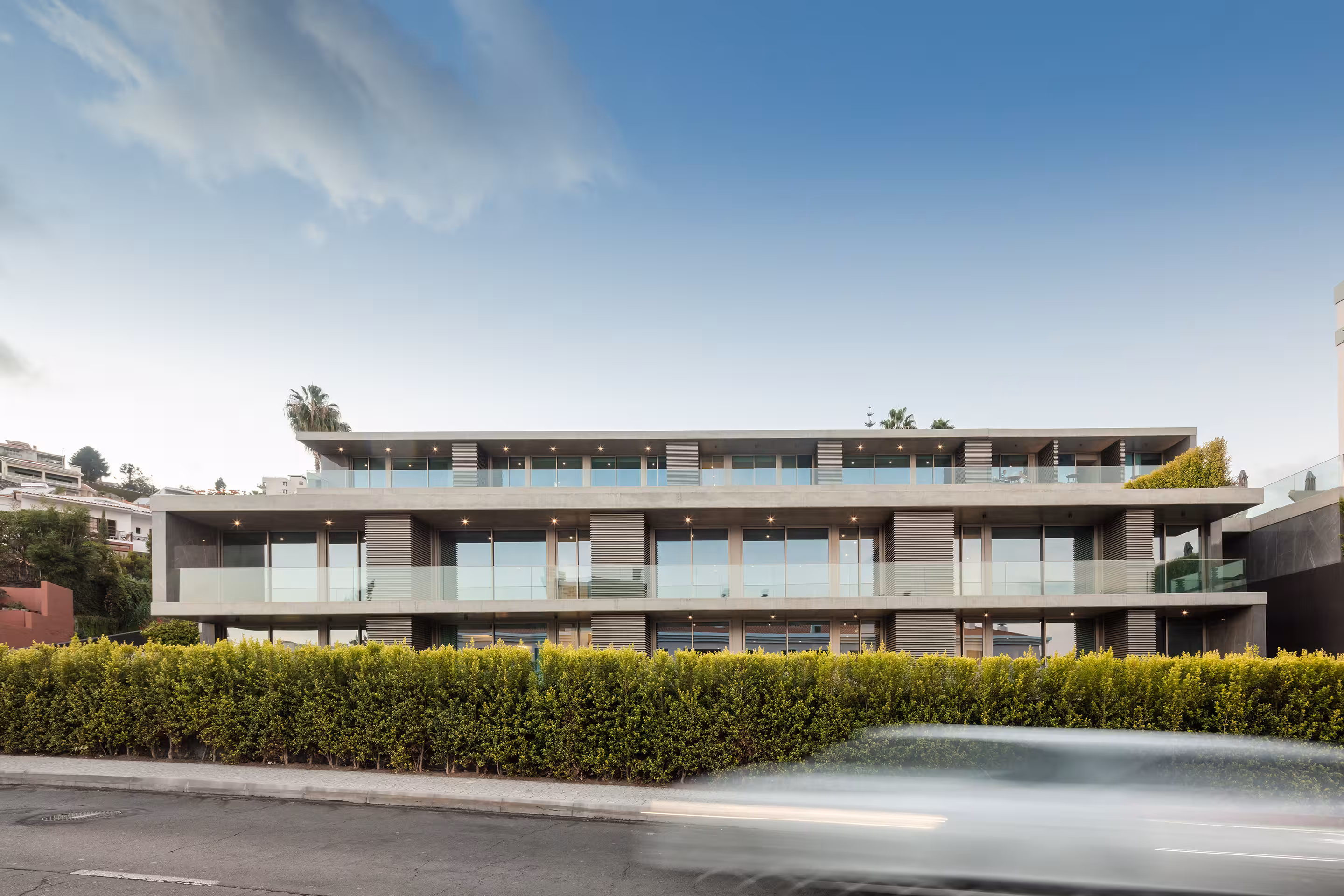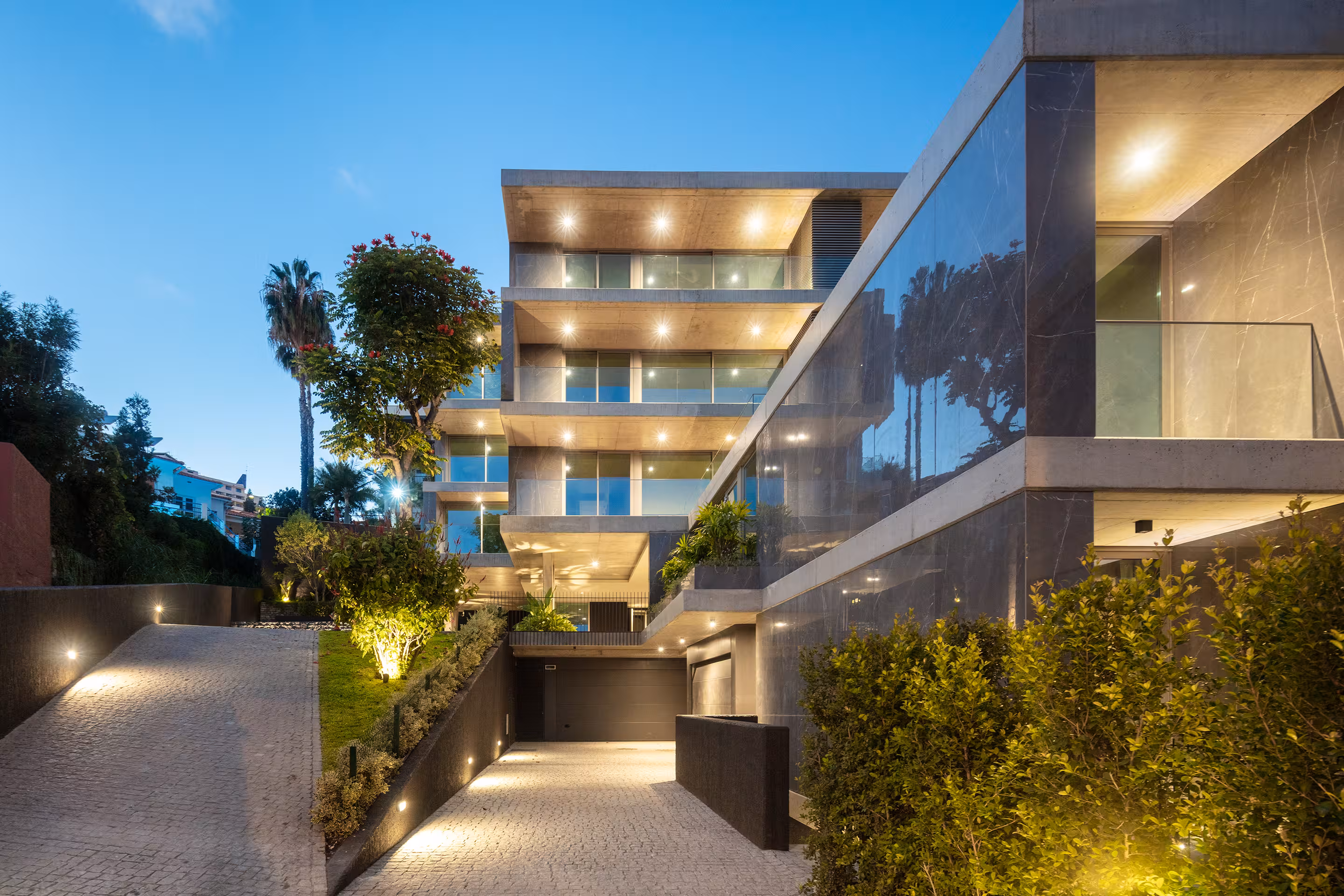 A volumetria parte de uma matriz geométrica depurada, mas é intencionalmente desconstruída por avanços e recuos, grandes vãos e varandas que prolongam o interior e funcionam também como protecção solar. O betão estrutural à vista assume valor estético, enquanto os elementos cerâmicos verticais de grande formato, com padrão de mármore escuro, conferem profundidade e carácter às fachadas, reflectindo a envolvente e suavizando a leitura dos volumes.