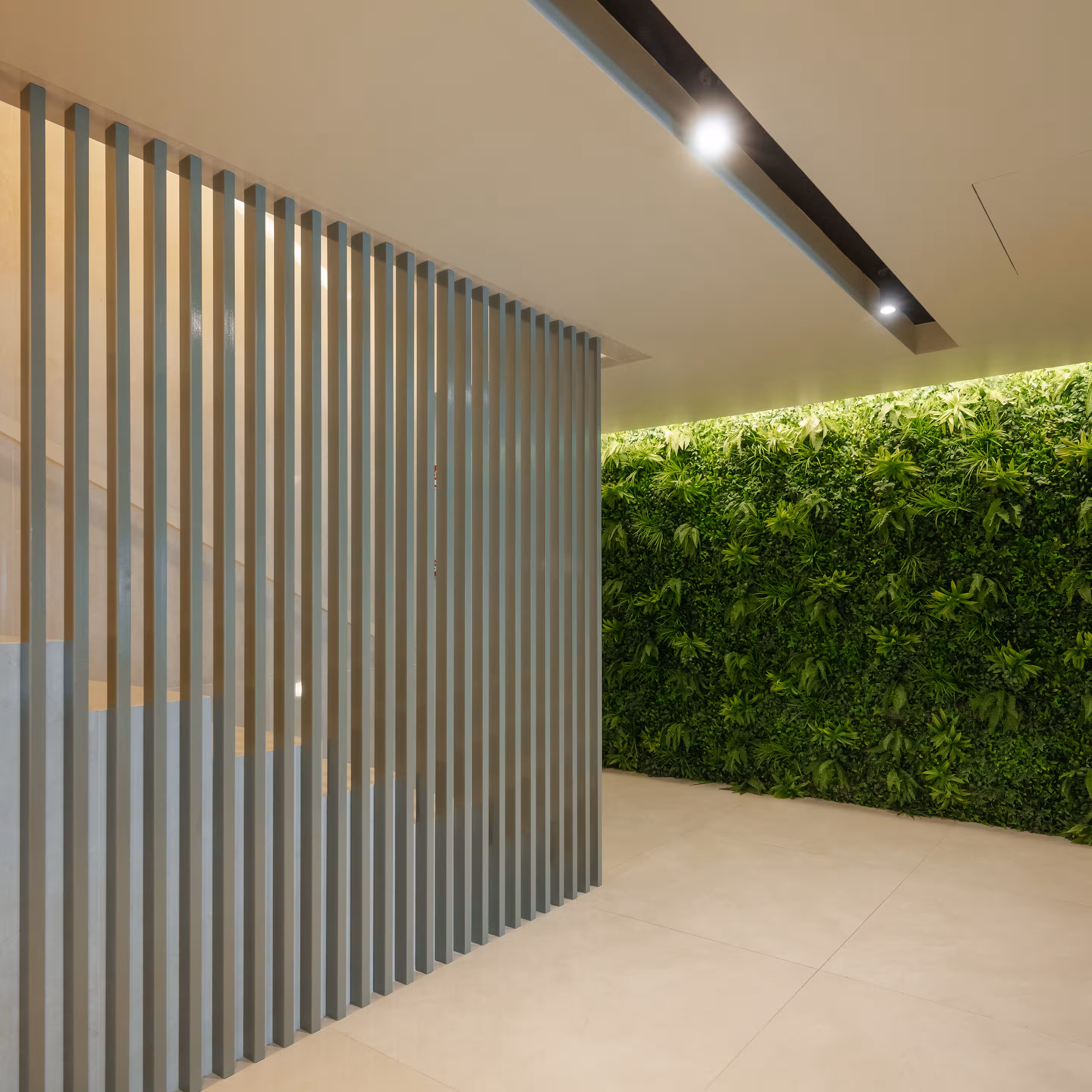 No interior, a linguagem é contida e elegante, com grandes planos e linhas simples, combinando madeira escura e painéis cerâmicos claros. O conjunto integra ainda uma componente hoteleira com circuitos independentes, incluindo unidades de alojamento e áreas de bem-estar (spa e piscina interior), onde a presença de elementos verdes e materiais mais crus reforça uma ligação subtil ao universo dos jardins.