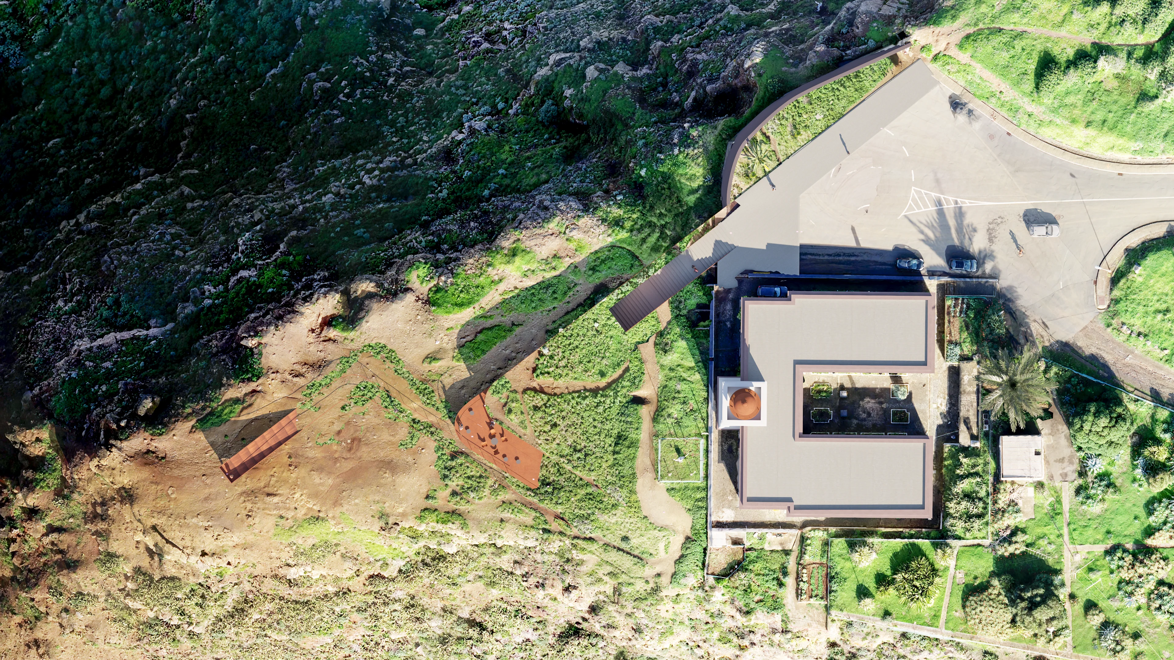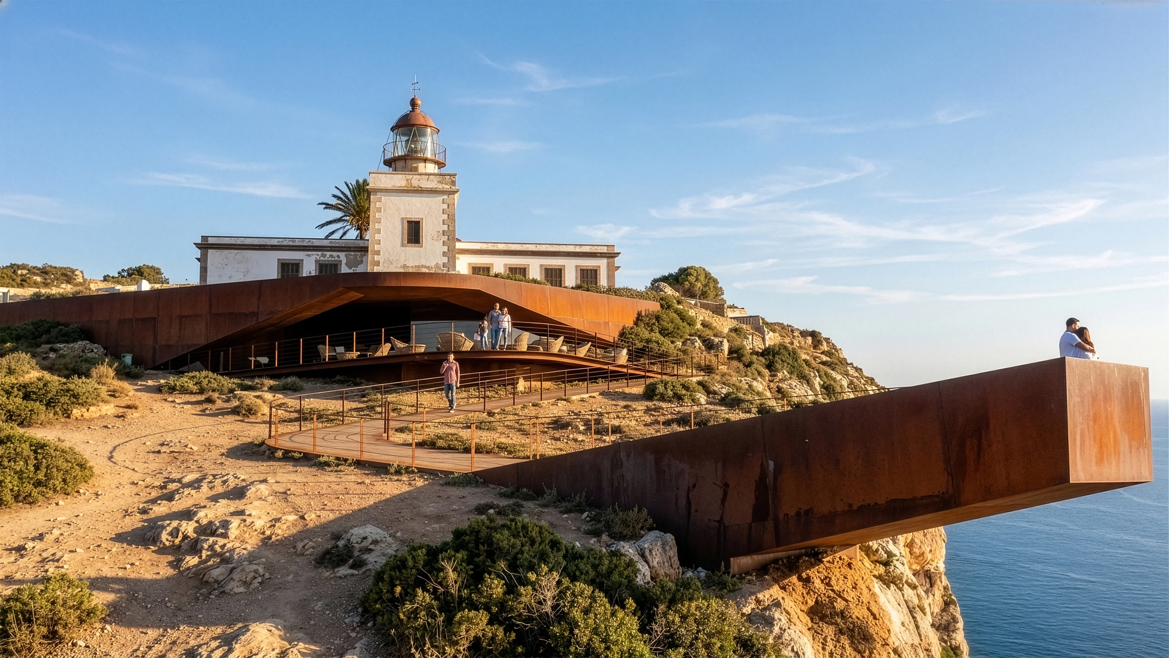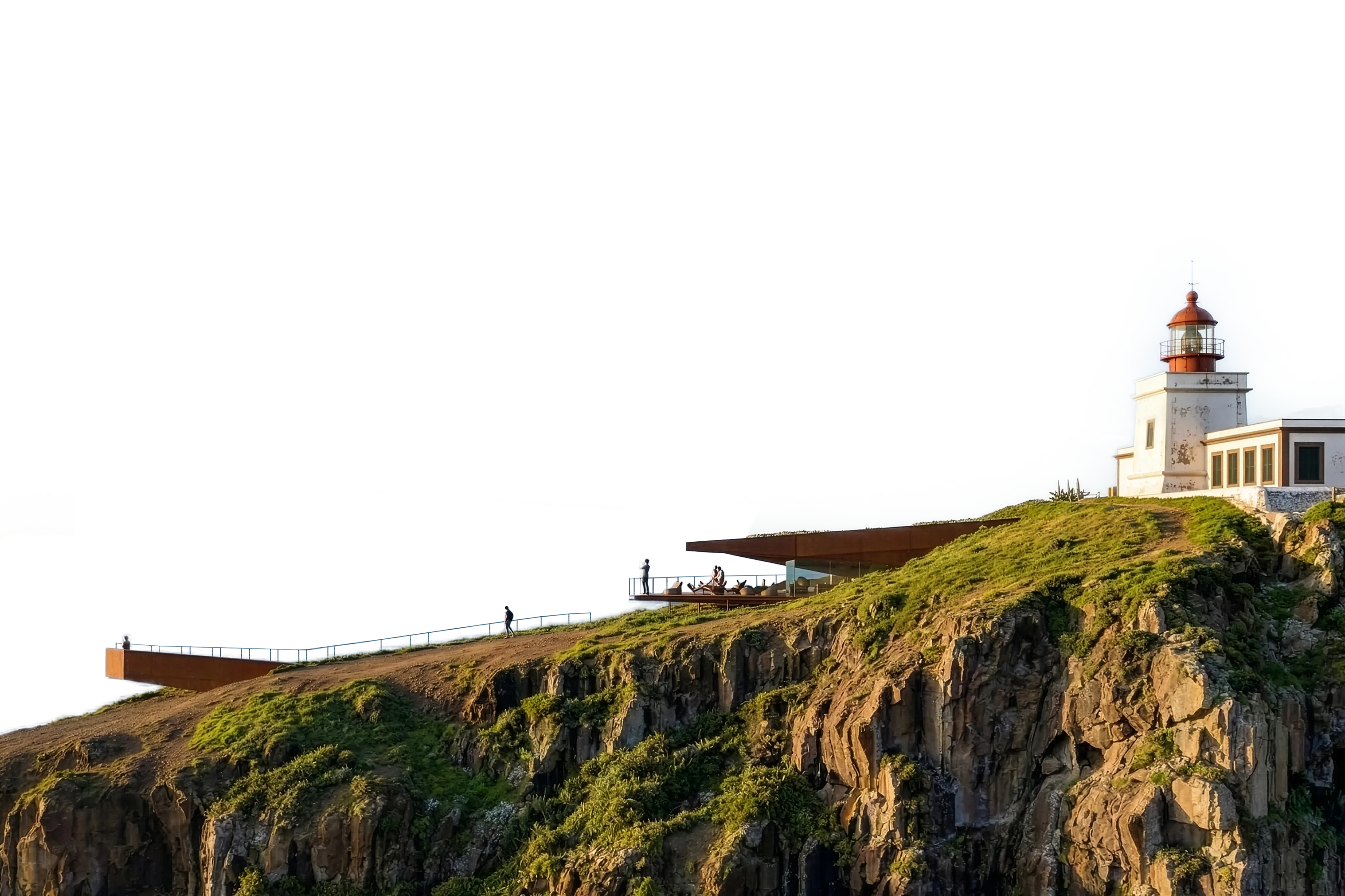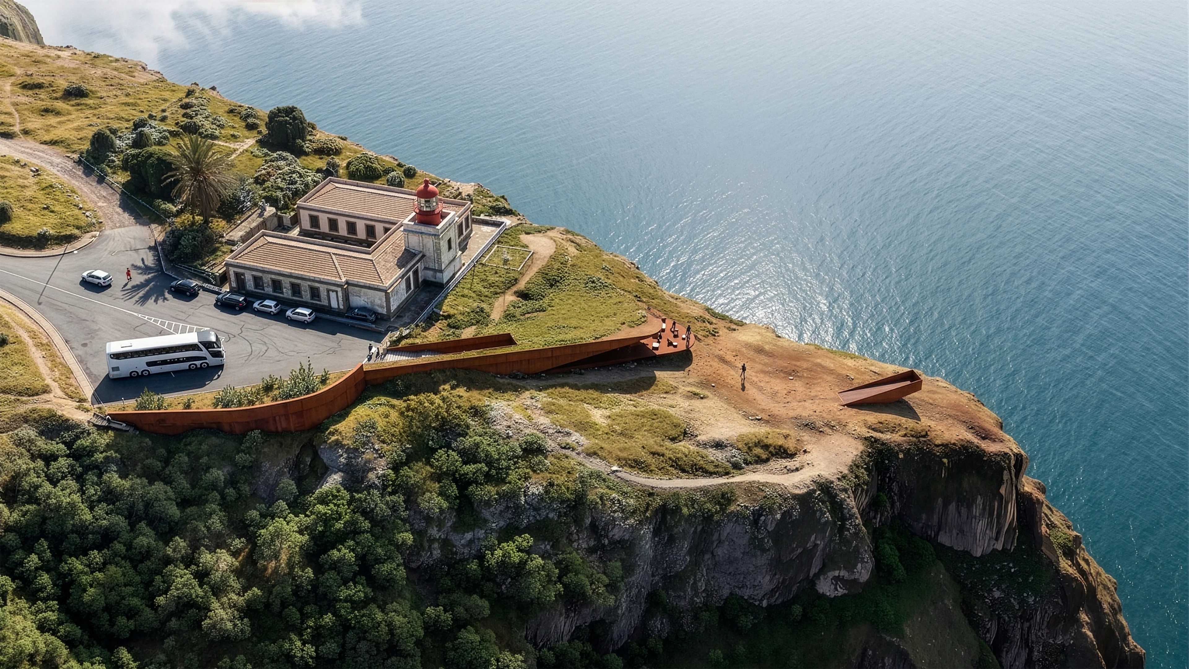 A proposta assume uma presença discreta, preservando o farol como referência identitária do lugar. O edifício de apoio — com restaurante, bar, loja e instalações sanitárias — adopta uma linguagem contida e horizontal, desenvolvendo-se próximo do terreno e com materialidade em tonalidades próximas da terra e da rocha, para reforçar a integração visual.