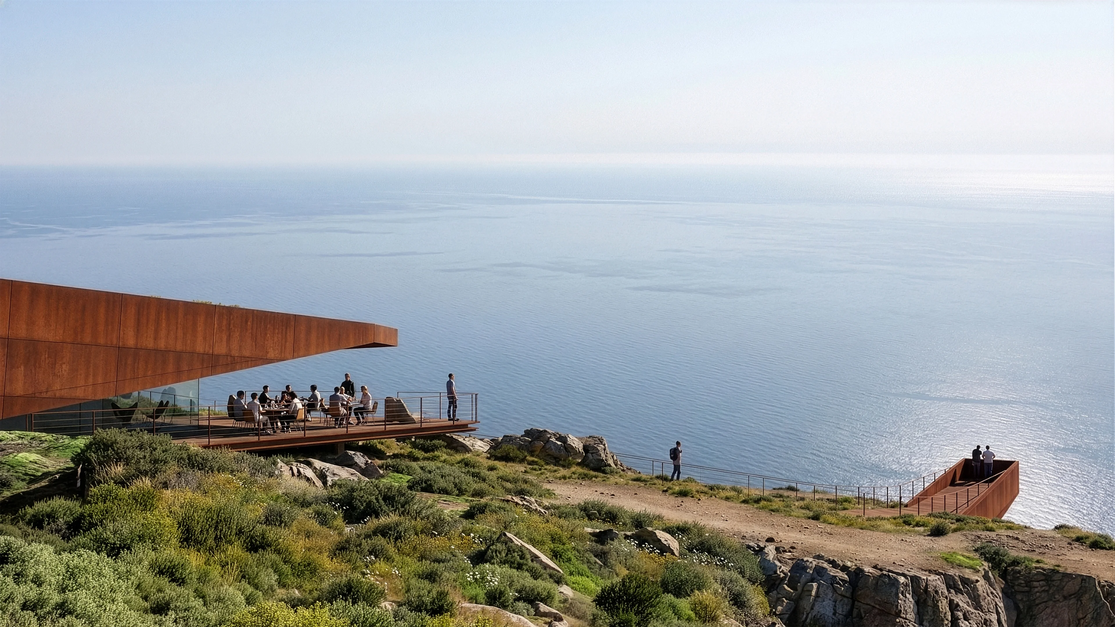 O miradouro constitui o gesto mais expressivo: um pontão panorâmico de livre circulação, quase sobre o oceano, pensado como percurso e espaço de permanência, com vistas de 360 graus. Plataformas intermédias e zonas de estadia marcam momentos de pausa e contemplação, garantindo segurança e continuidade visual ao longo do trajecto.