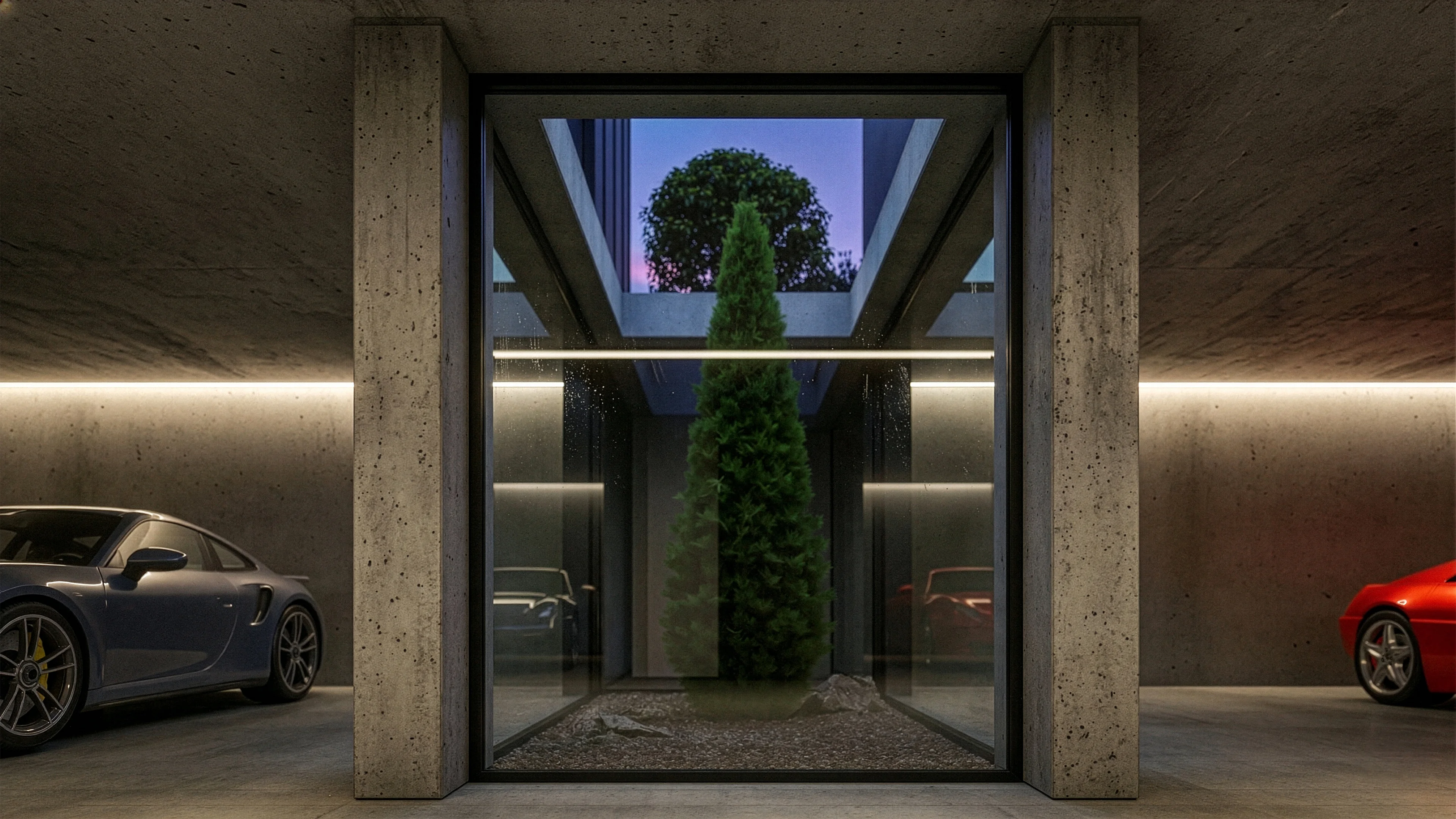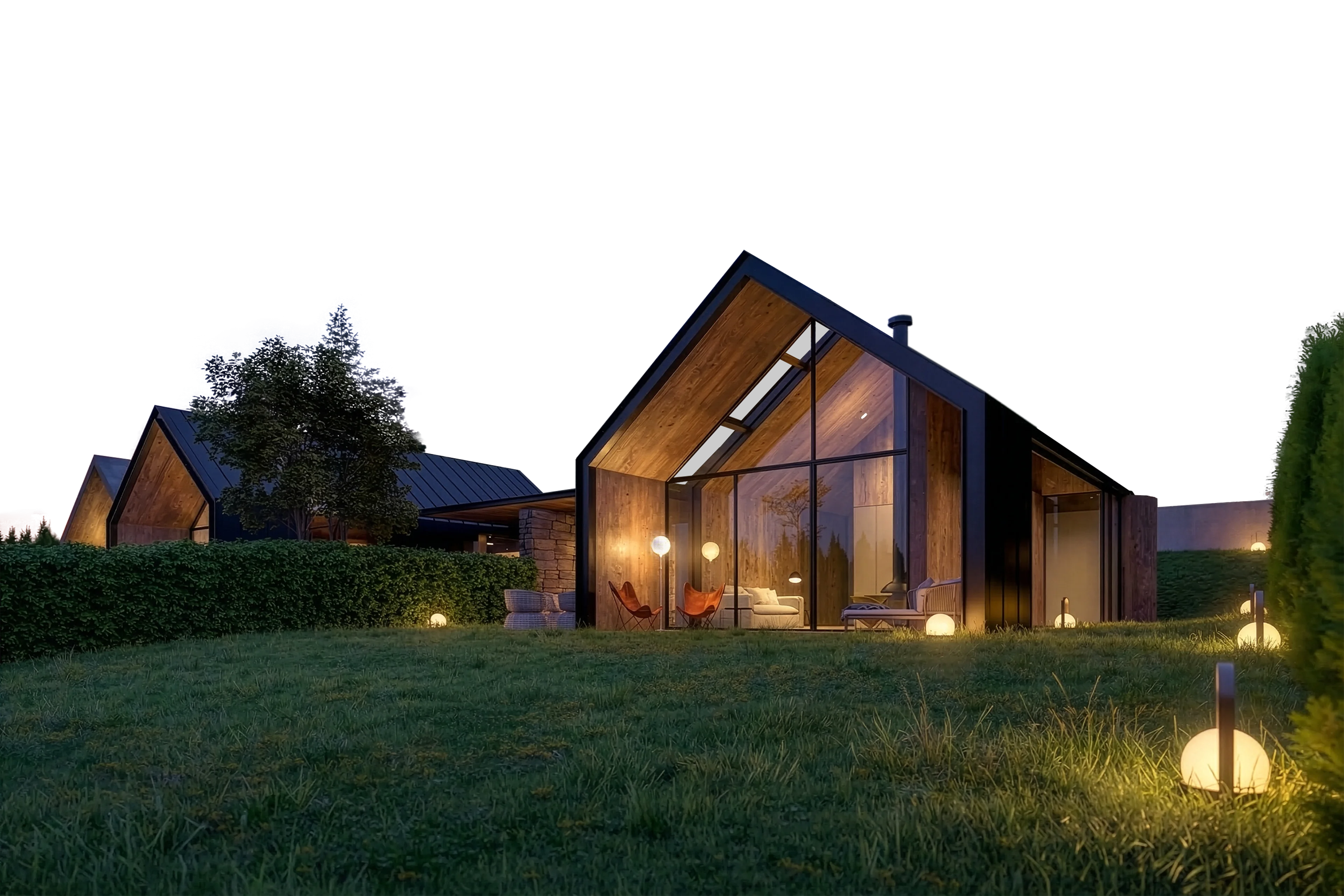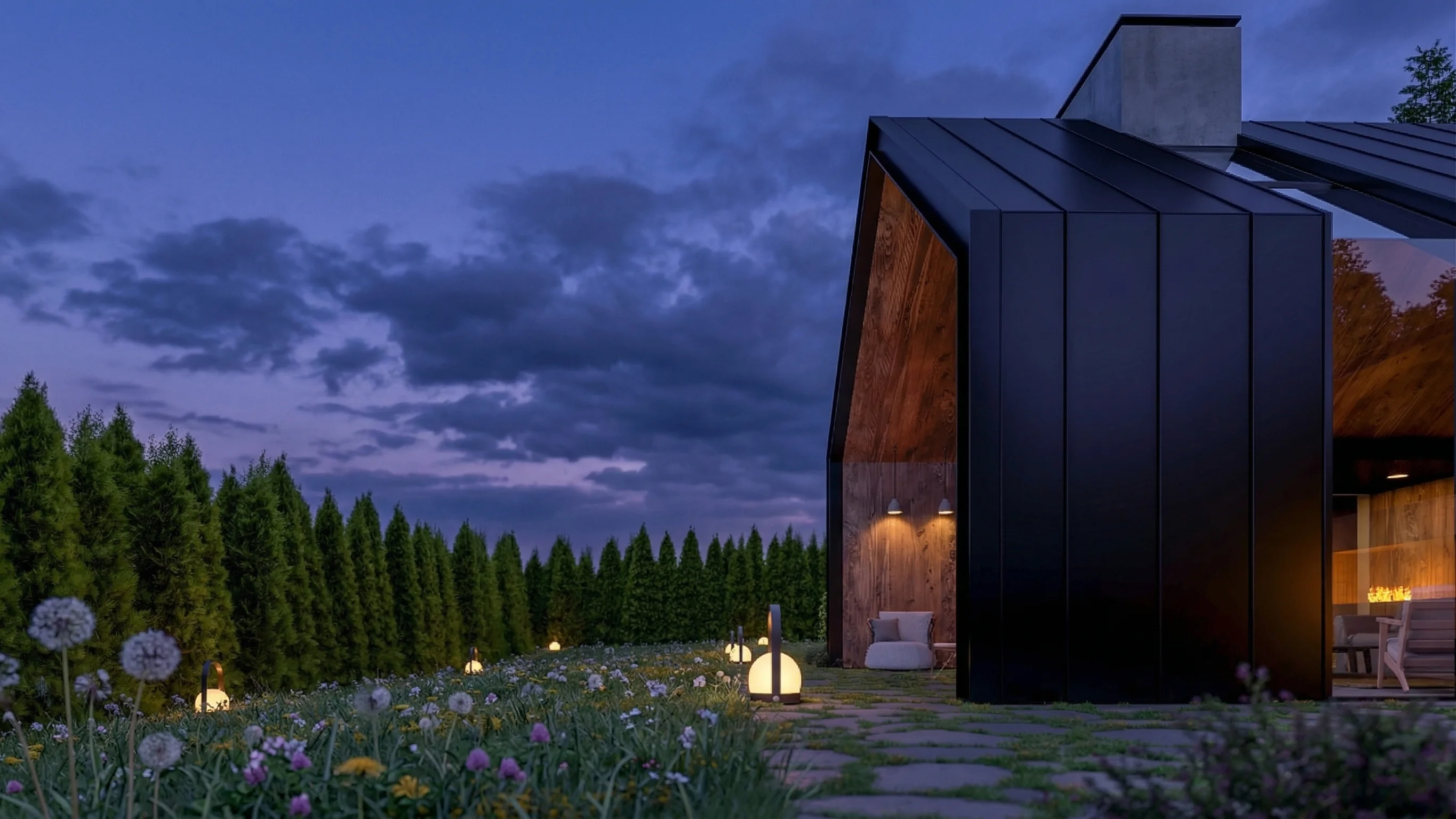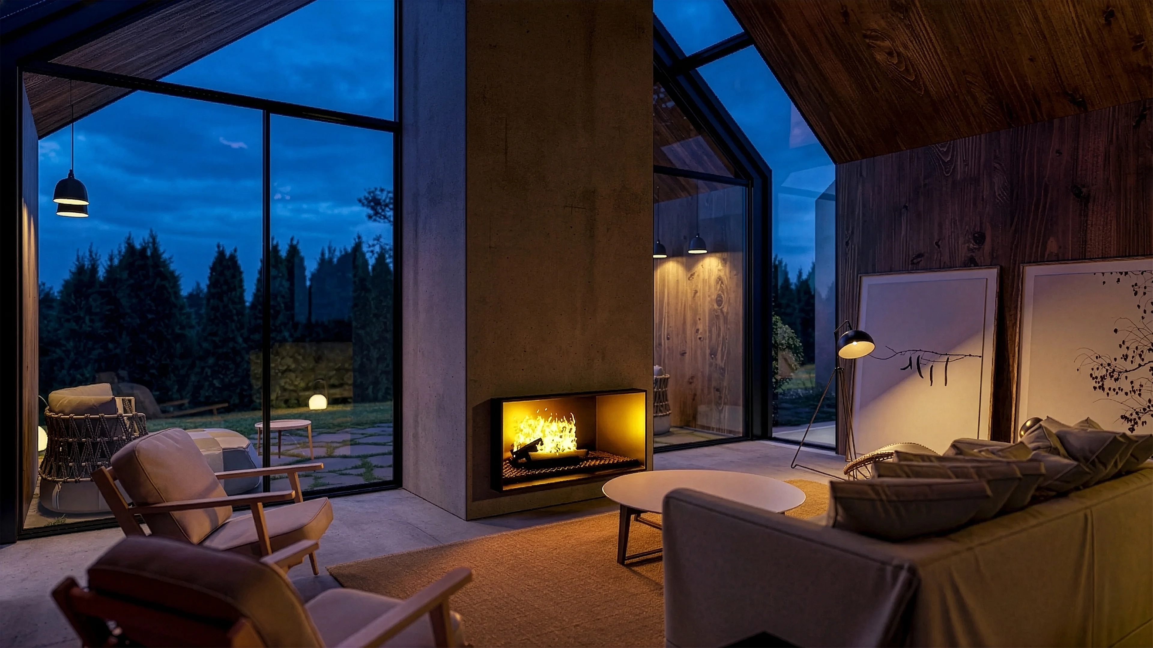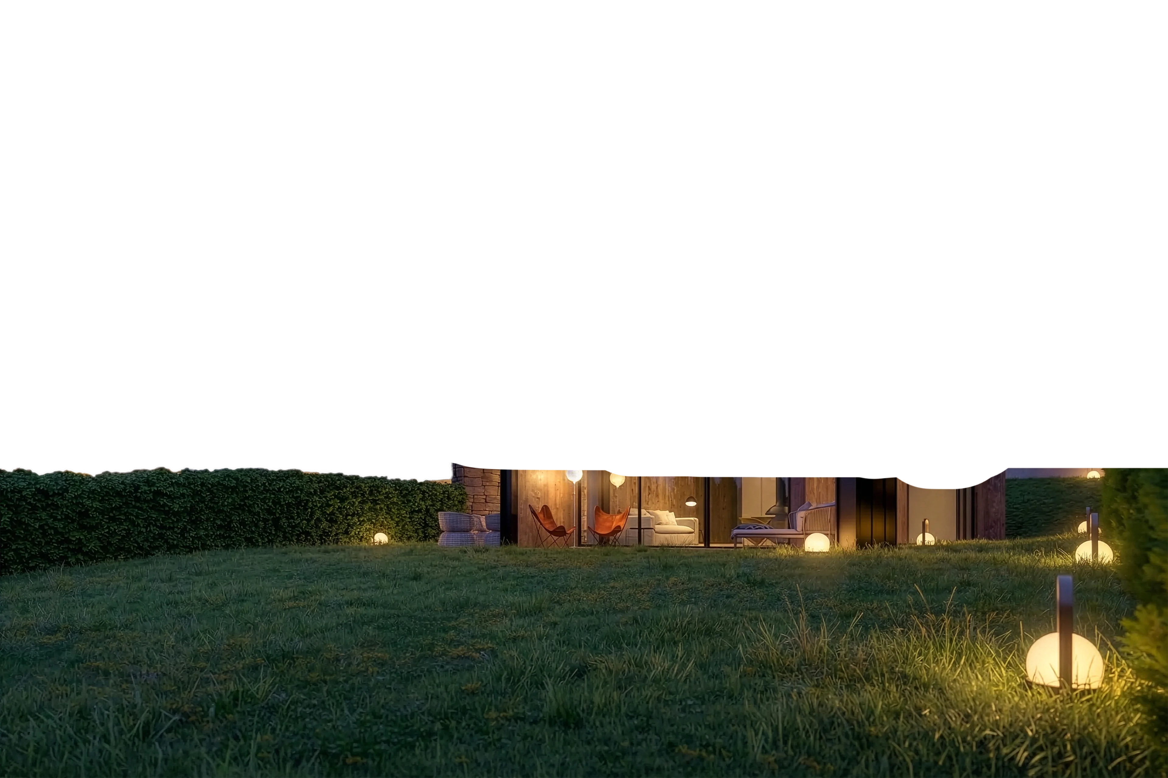 A implantação adapta-se à topografia existente, integrando áreas técnicas e estacionamento na cota inferior e libertando o piso principal para a vivência social voltada ao jardim, com continuidade entre sala, alpendre e relvado. A expressão arquitectónica resulta do diálogo entre betão aparente, madeira e amplos planos envidraçados: o betão confere massa e protecção; a madeira introduz textura e conforto; os envidraçados maximizam a entrada de luz natural, particularmente relevante numa zona onde a nebulosidade é frequente.