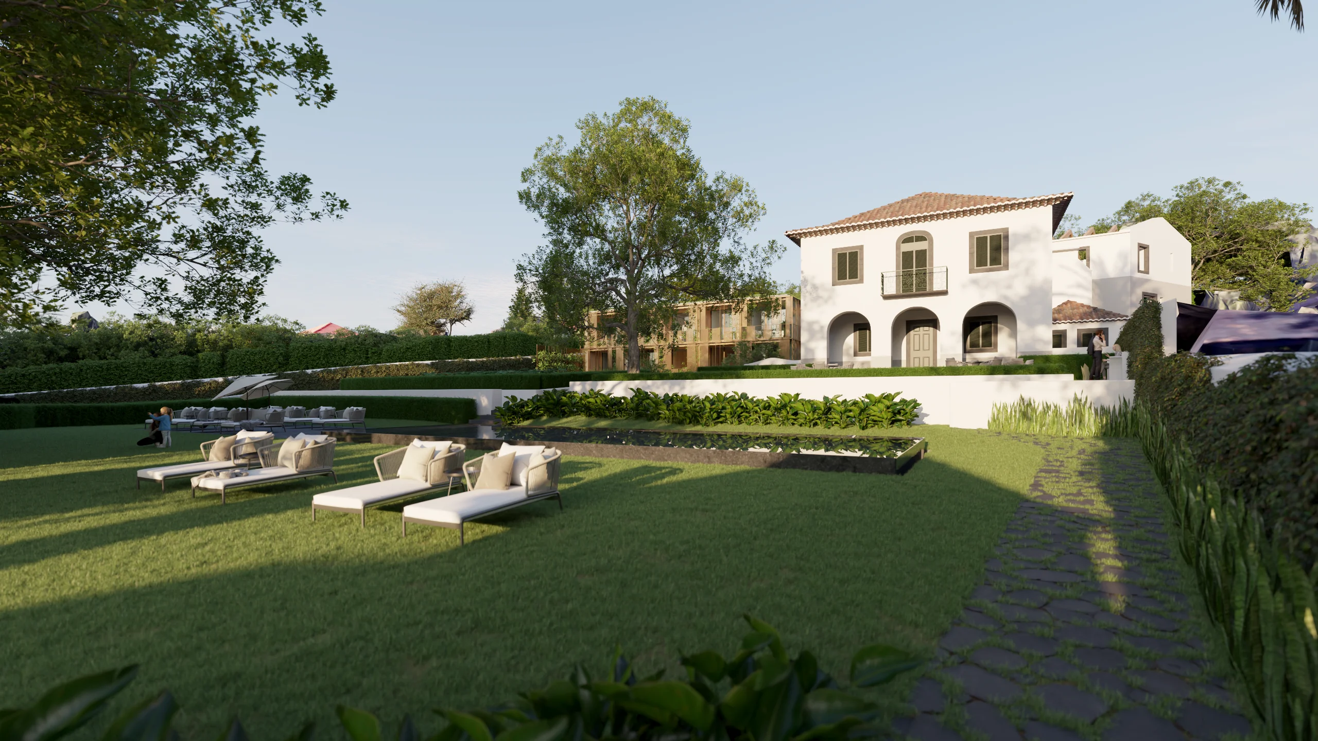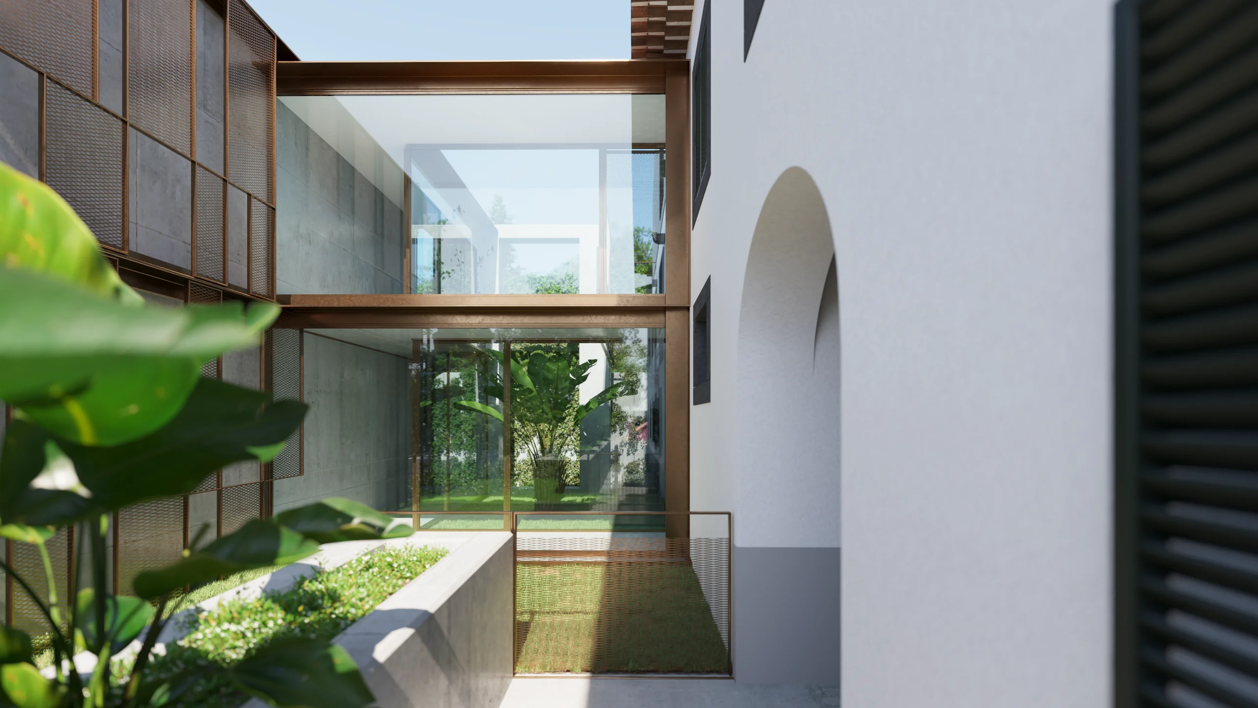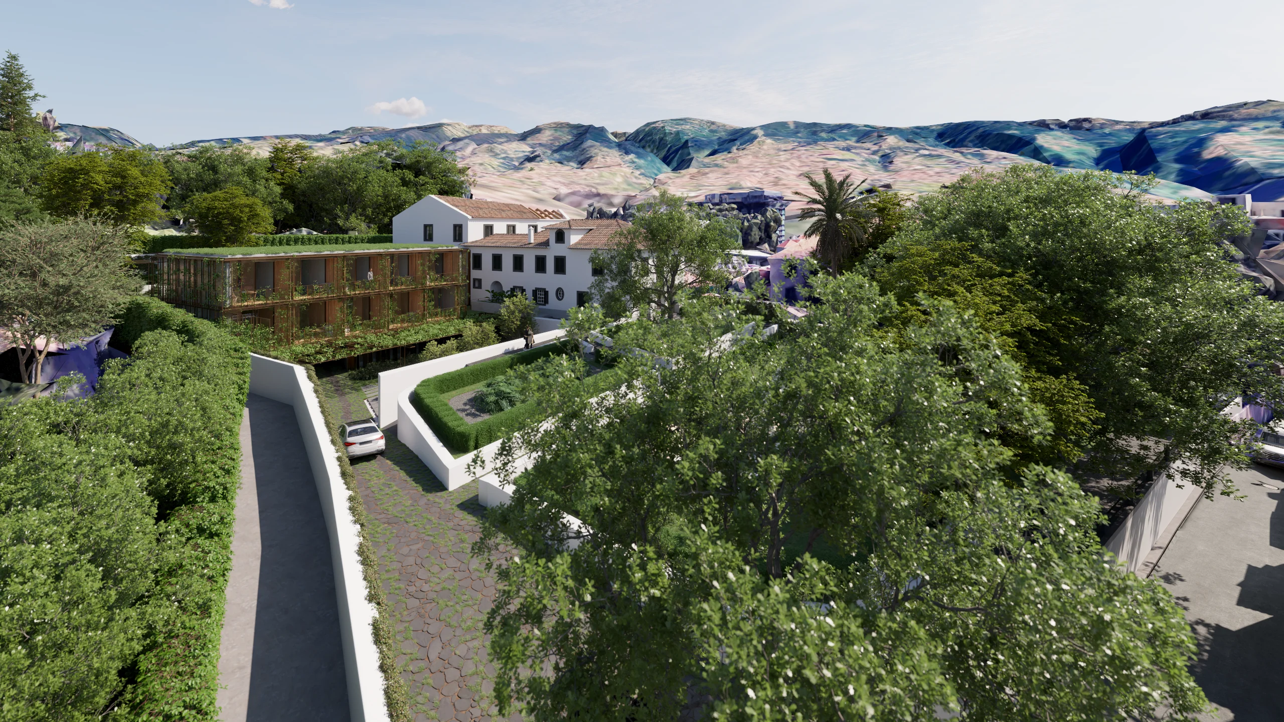 Entre a casa-mãe e o antigo armazém, um pátio interior funciona como elemento articulador, assegurando iluminação, ventilação e relação directa com o jardim. A nova construção desenvolve-se a partir de uma cota inferior, com linguagem contemporânea e contida: a volumetria acompanha a topografia e integra-se na estrutura verde da quinta, reduzindo o impacto visual quando observada das cotas superiores. A cobertura ajardinada prolonga o plano natural do jardim e reforça a continuidade paisagística.