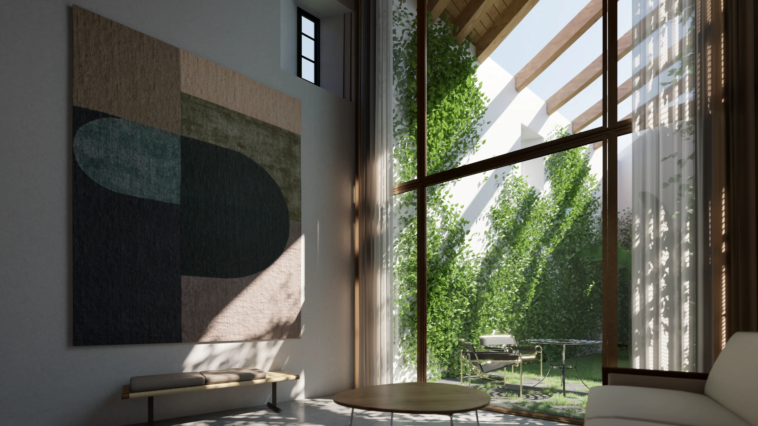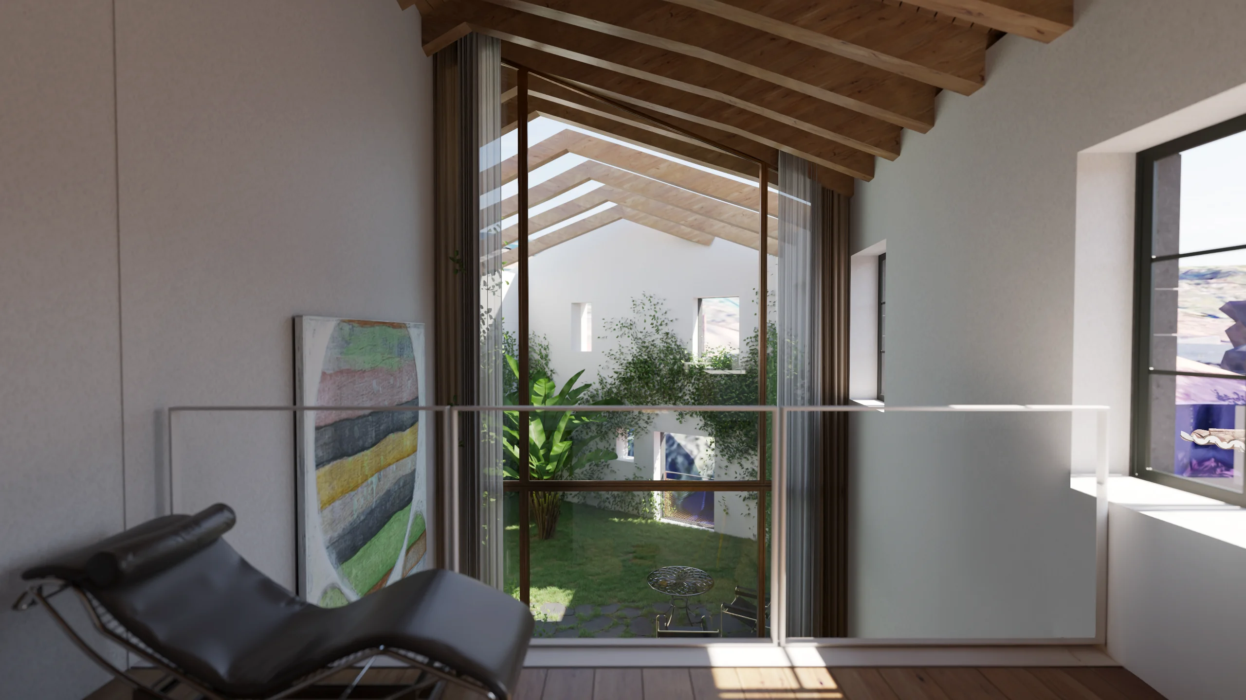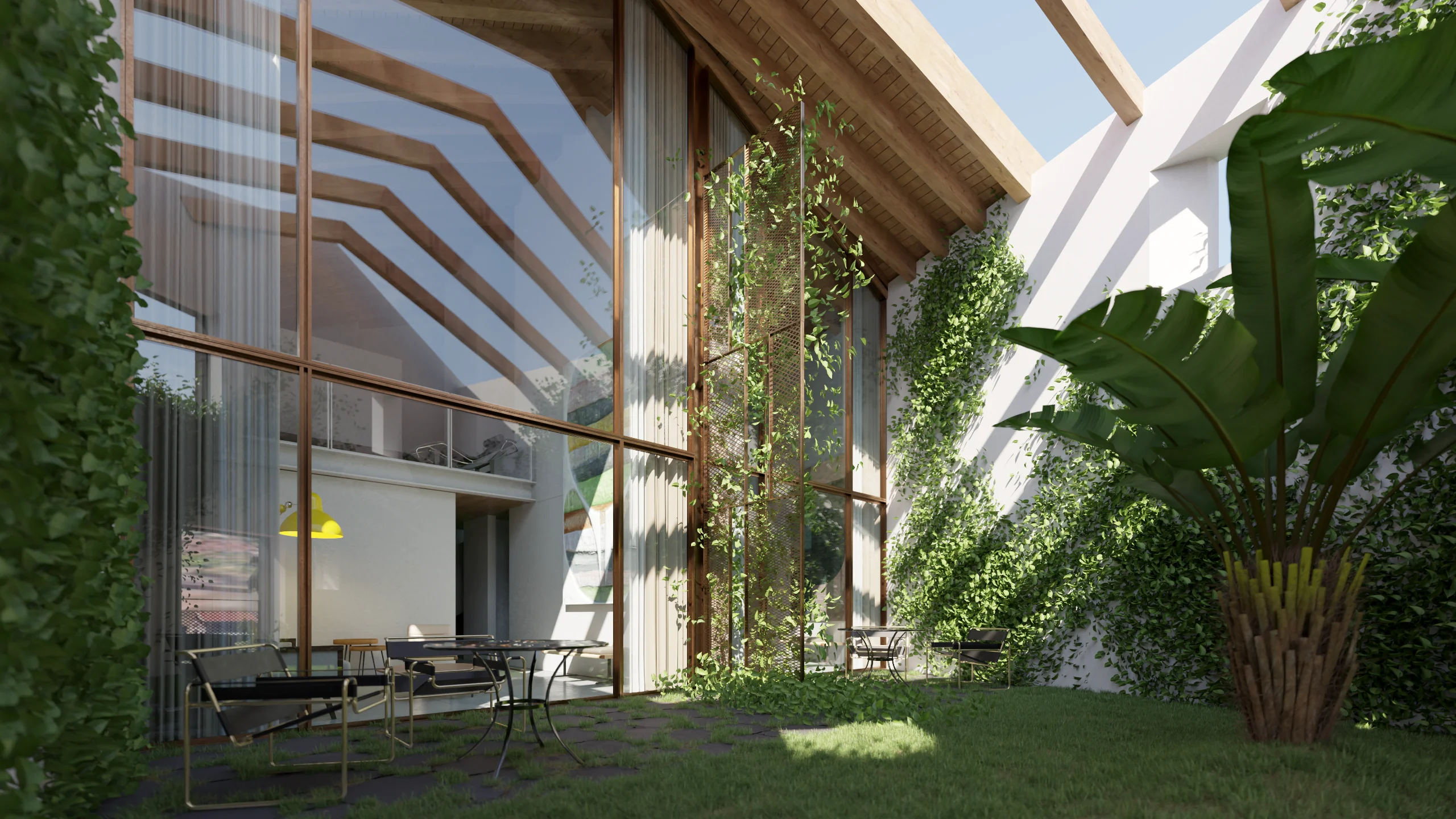Entre a casa-mãe e o antigo armazém, um pátio interior funciona como elemento articulador, assegurando iluminação, ventilação e relação directa com o jardim. A nova construção desenvolve-se a partir de uma cota inferior, com linguagem contemporânea e contida: a volumetria acompanha a topografia e integra-se na estrutura verde da quinta, reduzindo o impacto visual quando observada das cotas superiores. A cobertura ajardinada prolonga o plano natural do jardim e reforça a continuidade paisagística.
