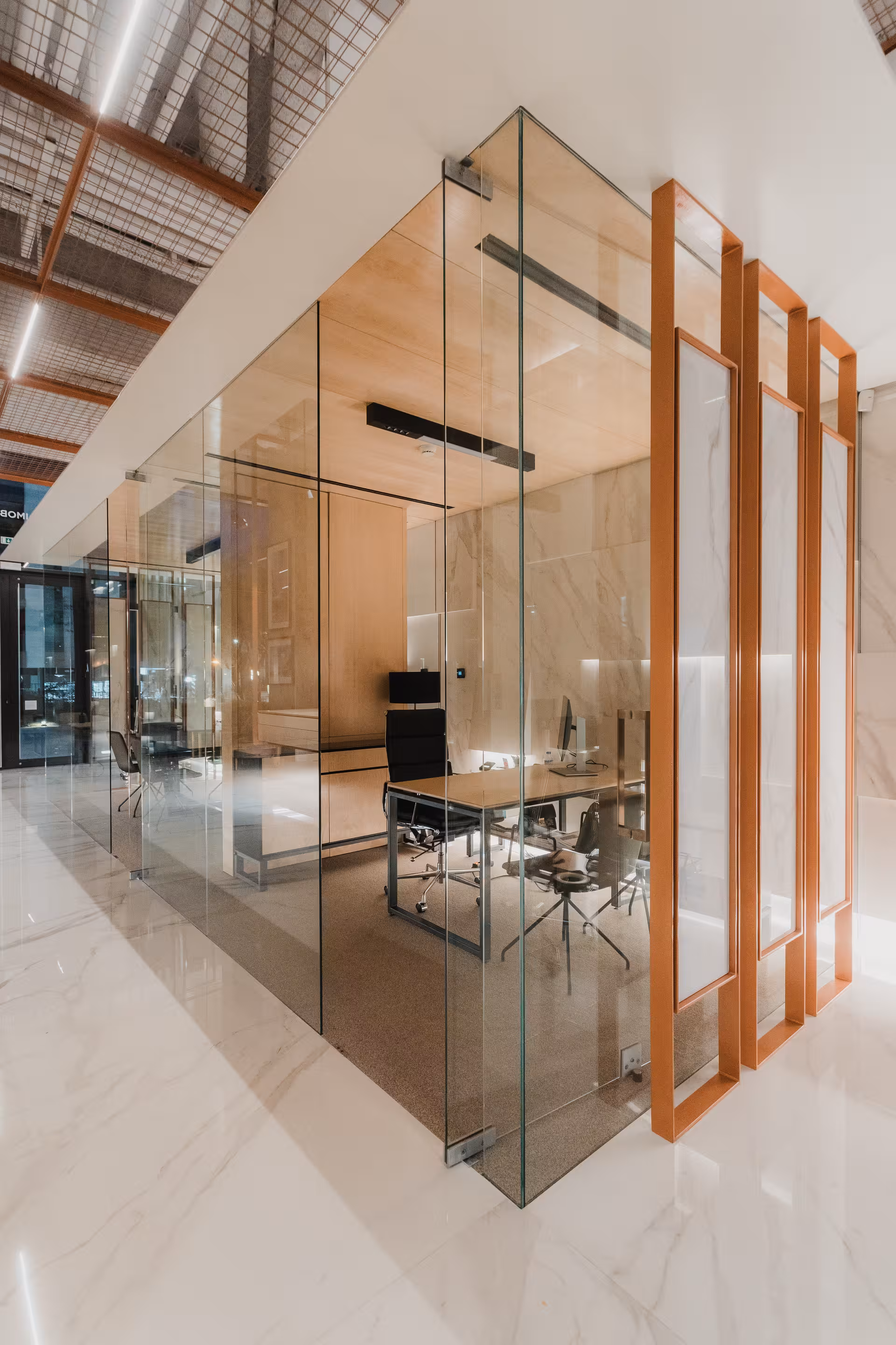 circulações de forma clara e intuitiva. O mobiliário, de linhas simples e proporções rigorosas, contribui para uma atmosfera serena e profissional, adequada à experiência do cliente e à apresentação do produto imobiliário.
