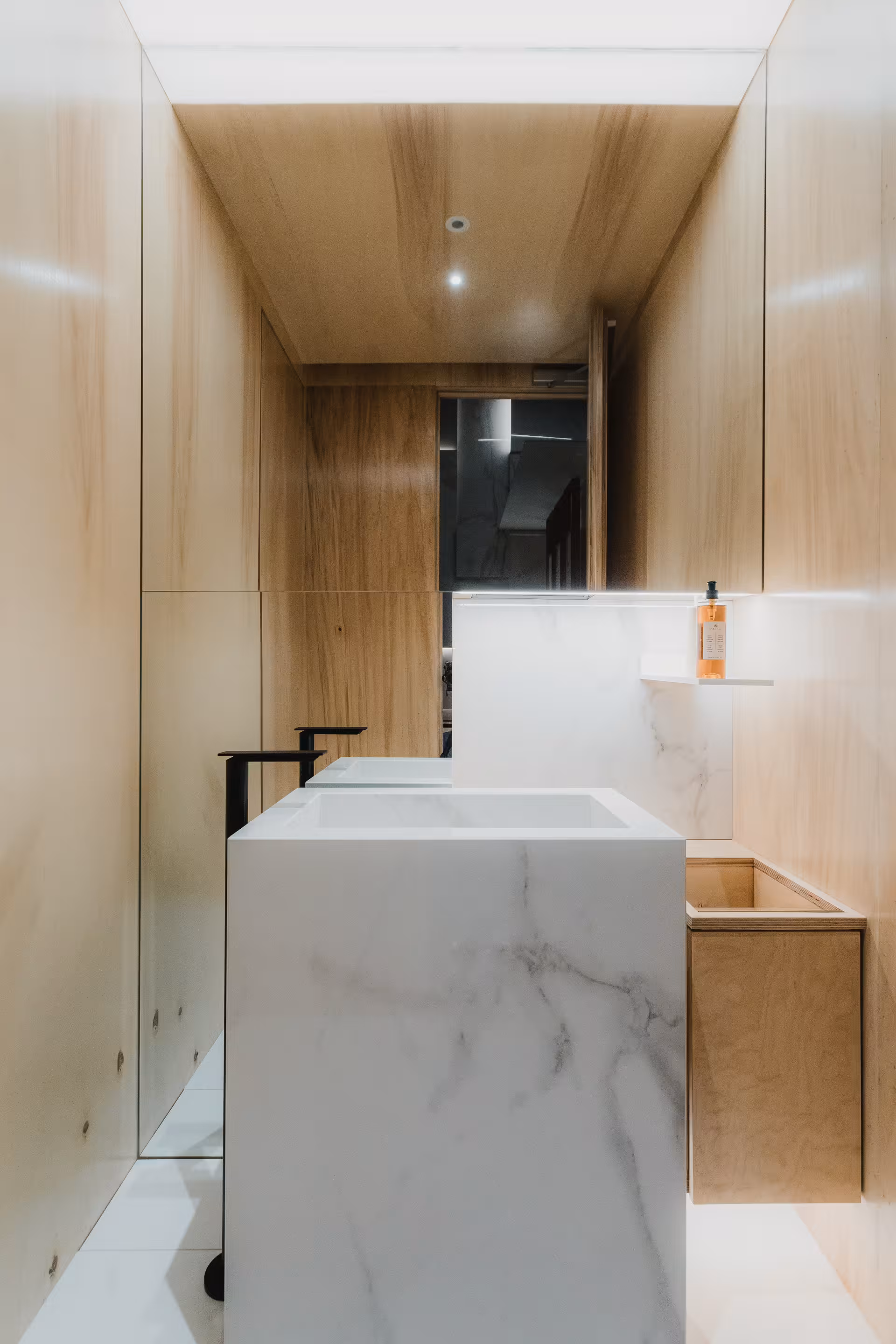 A materialidade é contida e cuidadosamente seleccionada, destacando-se superfícies contínuas em tons claros, madeira natural e vidro, numa composição minimalista que transmite elegância, sobriedade e intemporalidade. Os detalhes construtivos — perfis metálicos, caixilharias e iluminação linear — reforçam a precisão do desenho e a qualidade do conjunto.