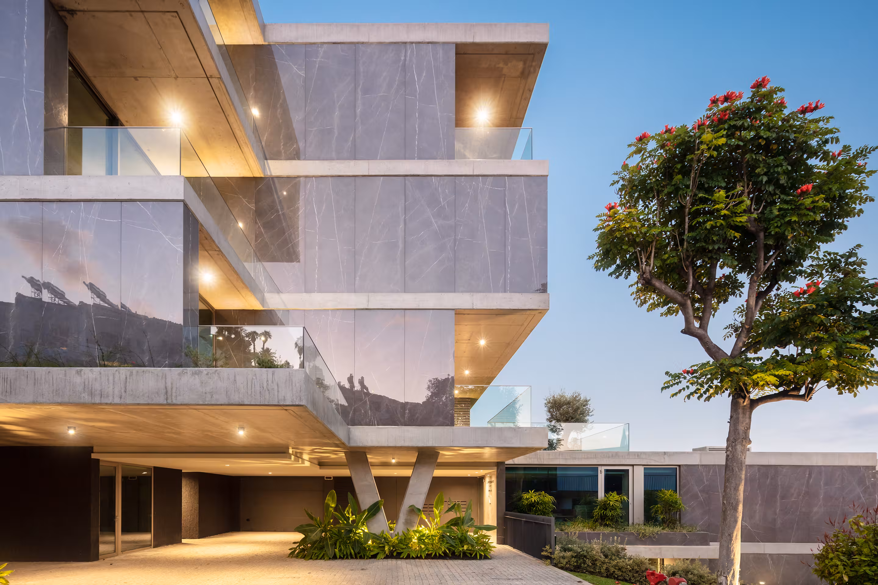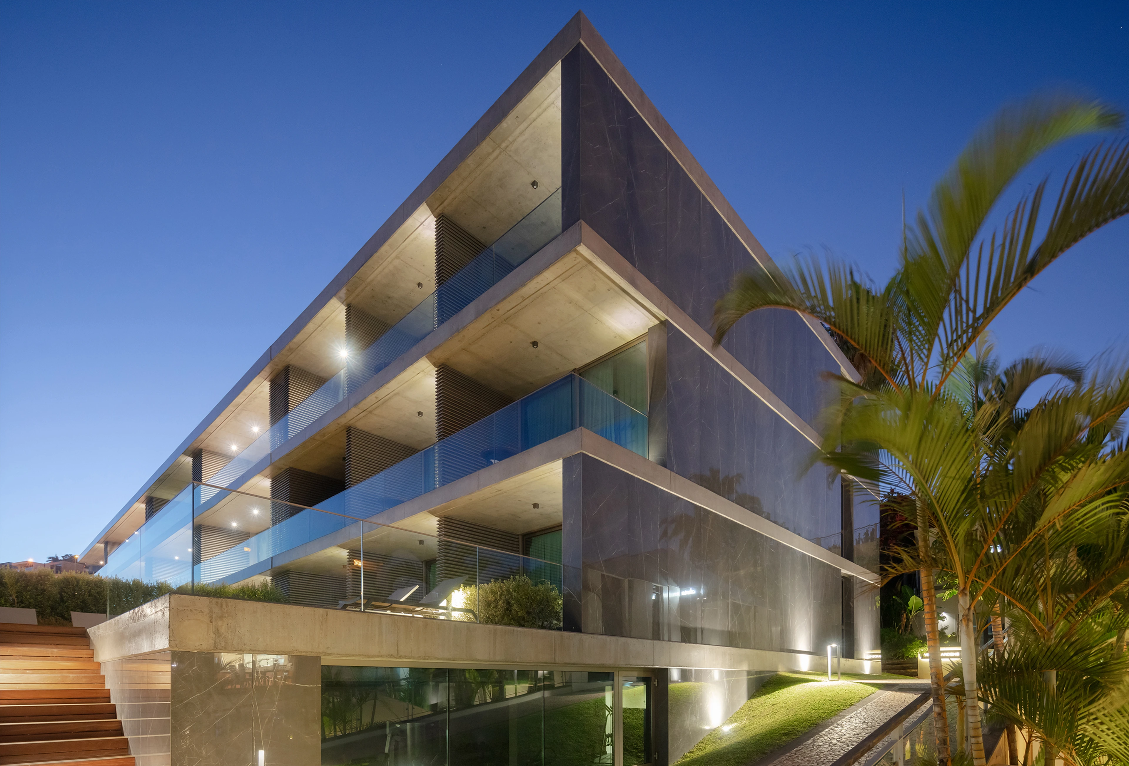 A volumetria parte de uma matriz geométrica depurada, mas é intencionalmente desconstruída por avanços e recuos, grandes vãos e varandas que prolongam o interior e funcionam também como protecção solar. O betão estrutural à vista assume valor estético, enquanto os elementos cerâmicos verticais de grande formato, com padrão de mármore escuro, conferem profundidade e carácter às fachadas, reflectindo a envolvente e suavizando a leitura dos volumes.