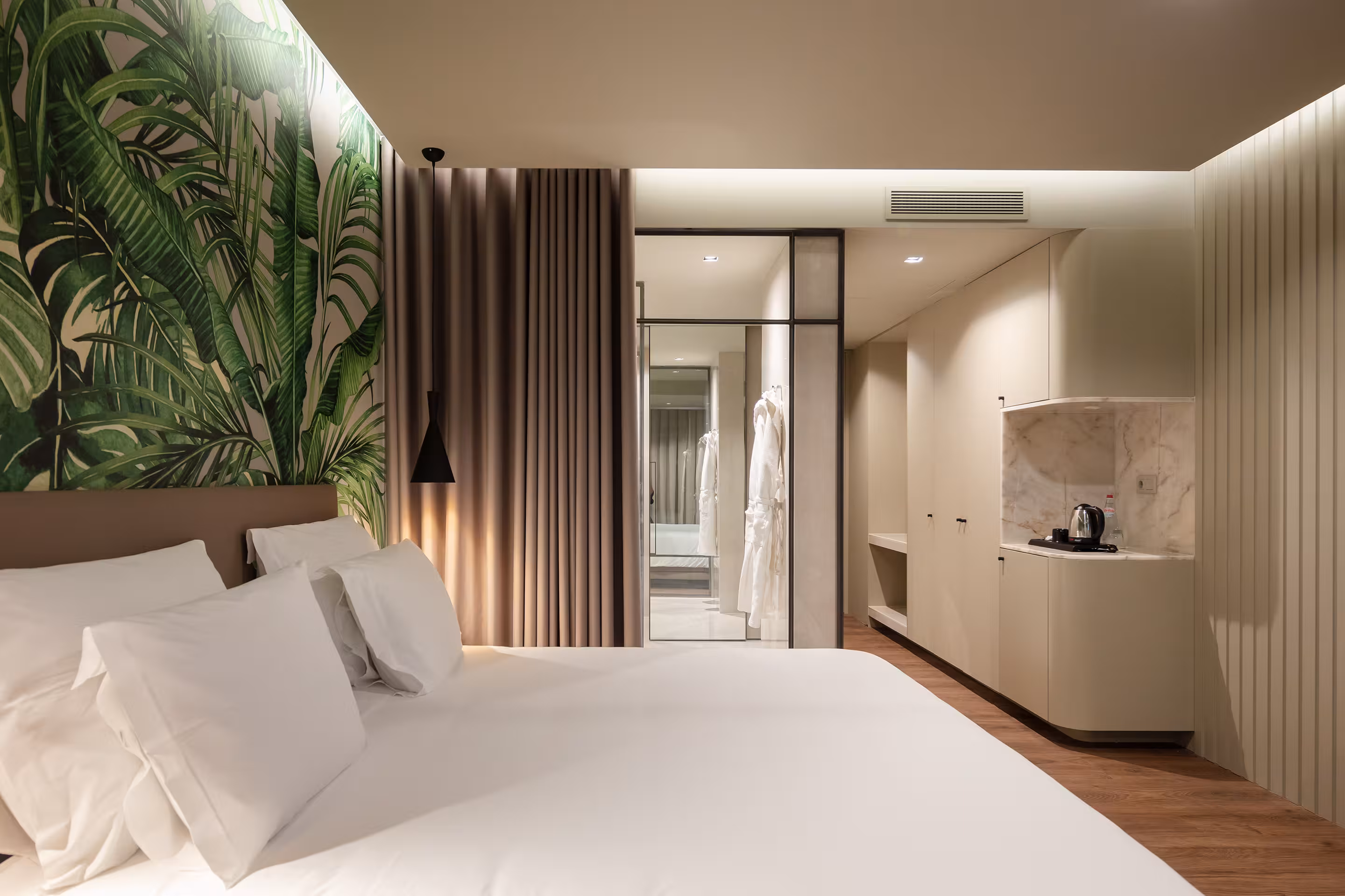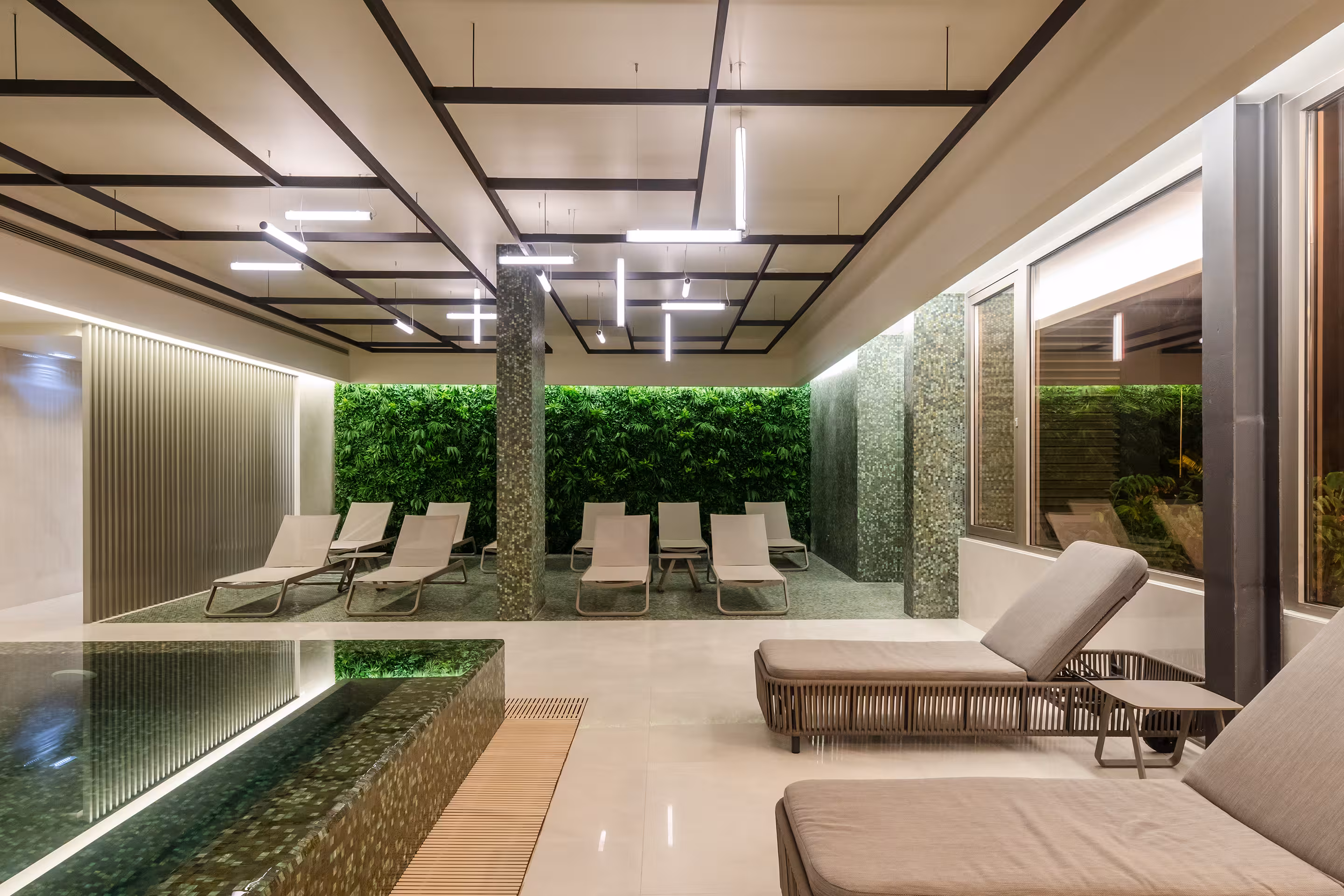 No interior, a linguagem é contida e elegante, com grandes planos e linhas simples, combinando madeira escura e painéis cerâmicos claros. O conjunto integra ainda uma componente hoteleira com circuitos independentes, incluindo unidades de alojamento e áreas de bem-estar (spa e piscina interior), onde a presença de elementos verdes e materiais mais crus reforça uma ligação subtil ao universo dos jardins.