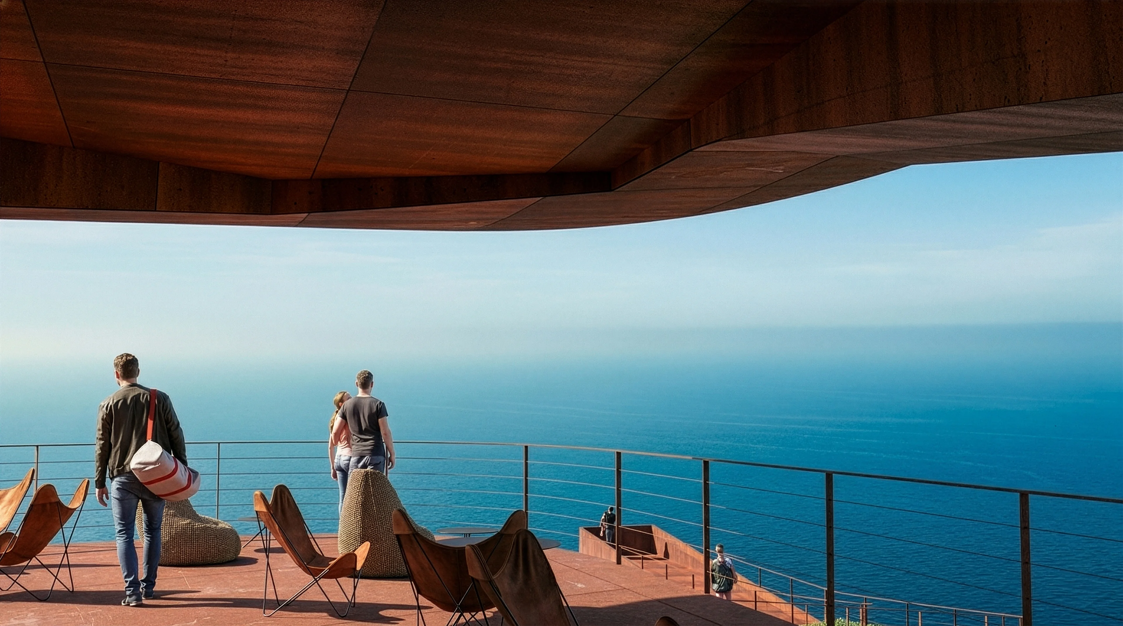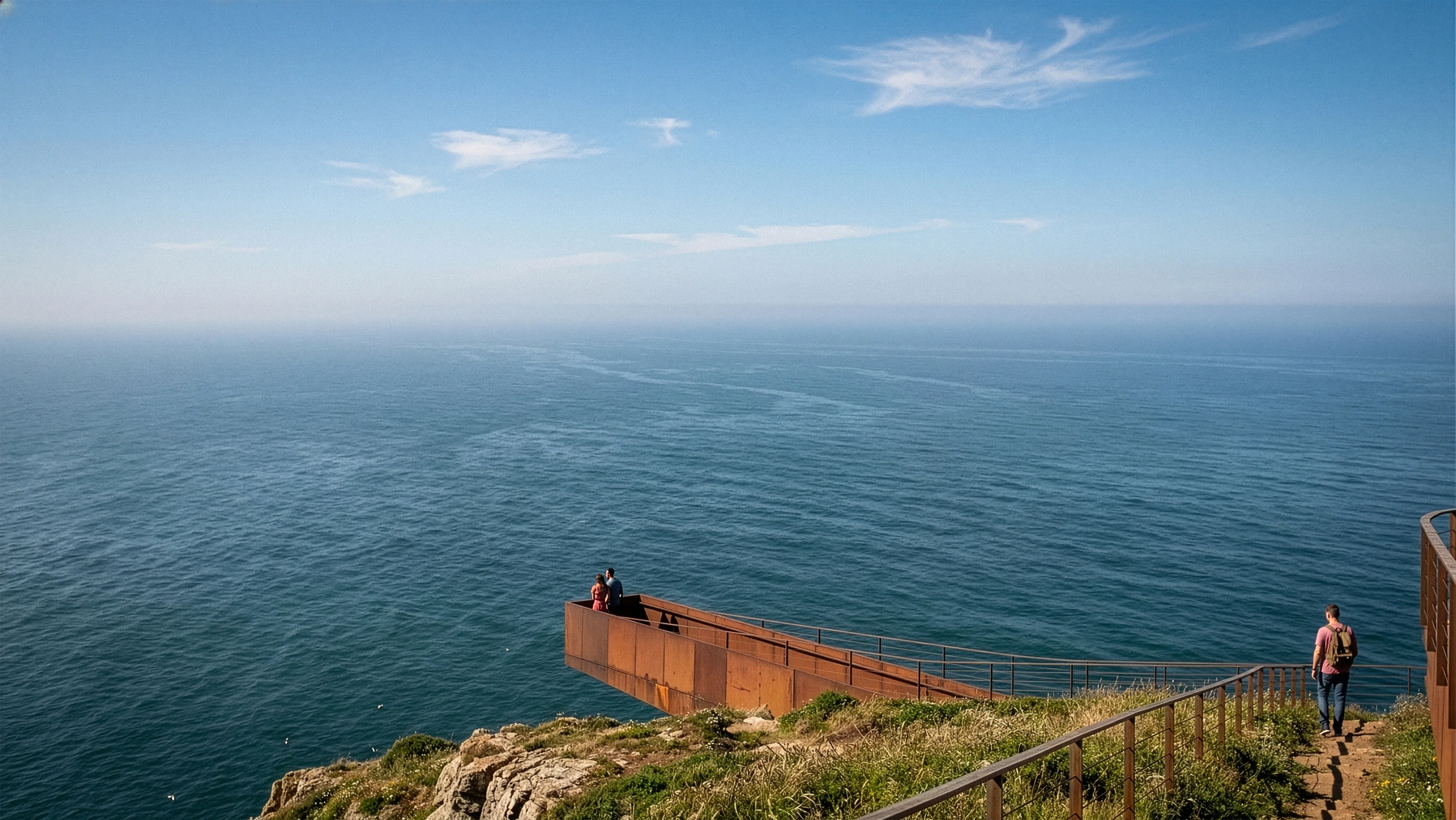 O miradouro constitui o gesto mais expressivo: um pontão panorâmico de livre circulação, quase sobre o oceano, pensado como percurso e espaço de permanência, com vistas de 360 graus. Plataformas intermédias e zonas de estadia marcam momentos de pausa e contemplação, garantindo segurança e continuidade visual ao longo do trajecto.