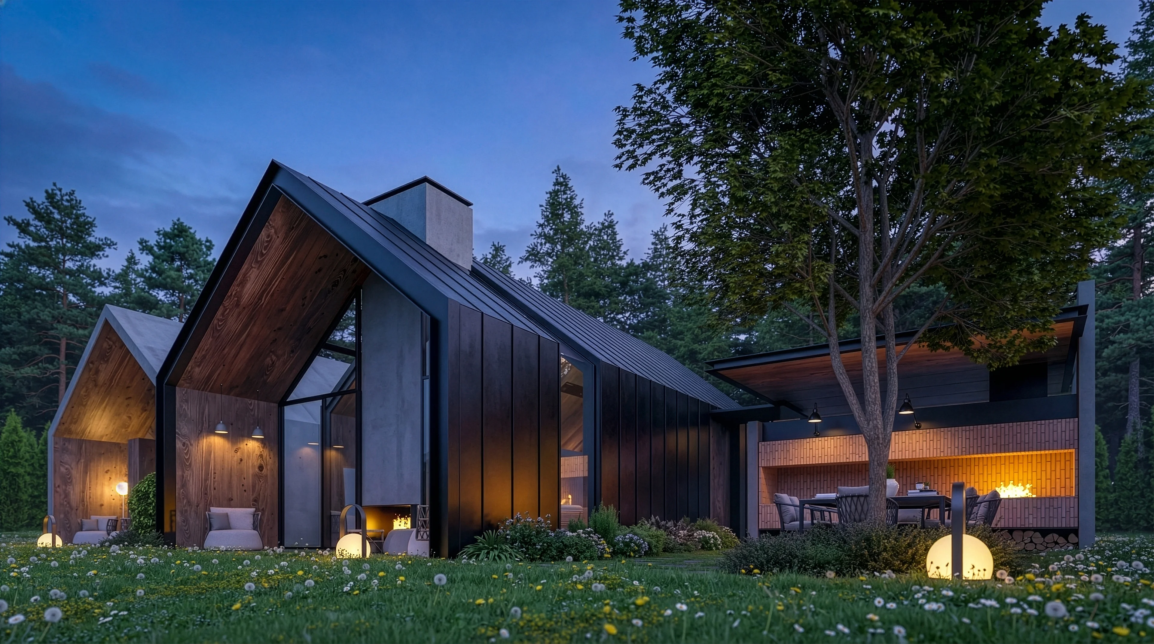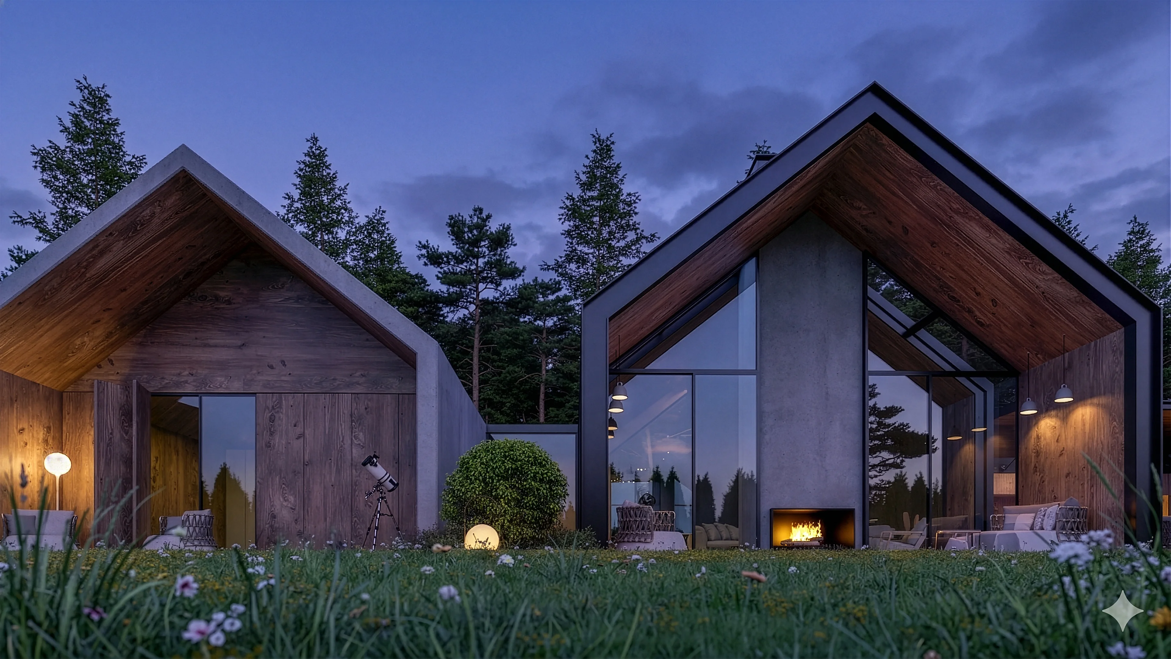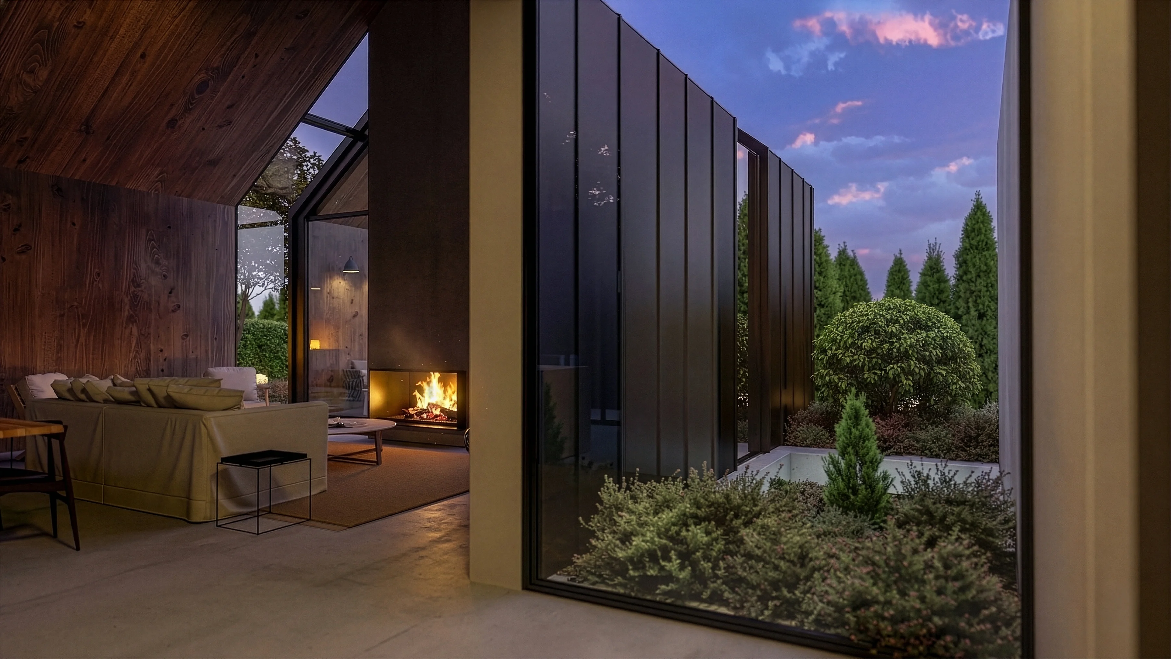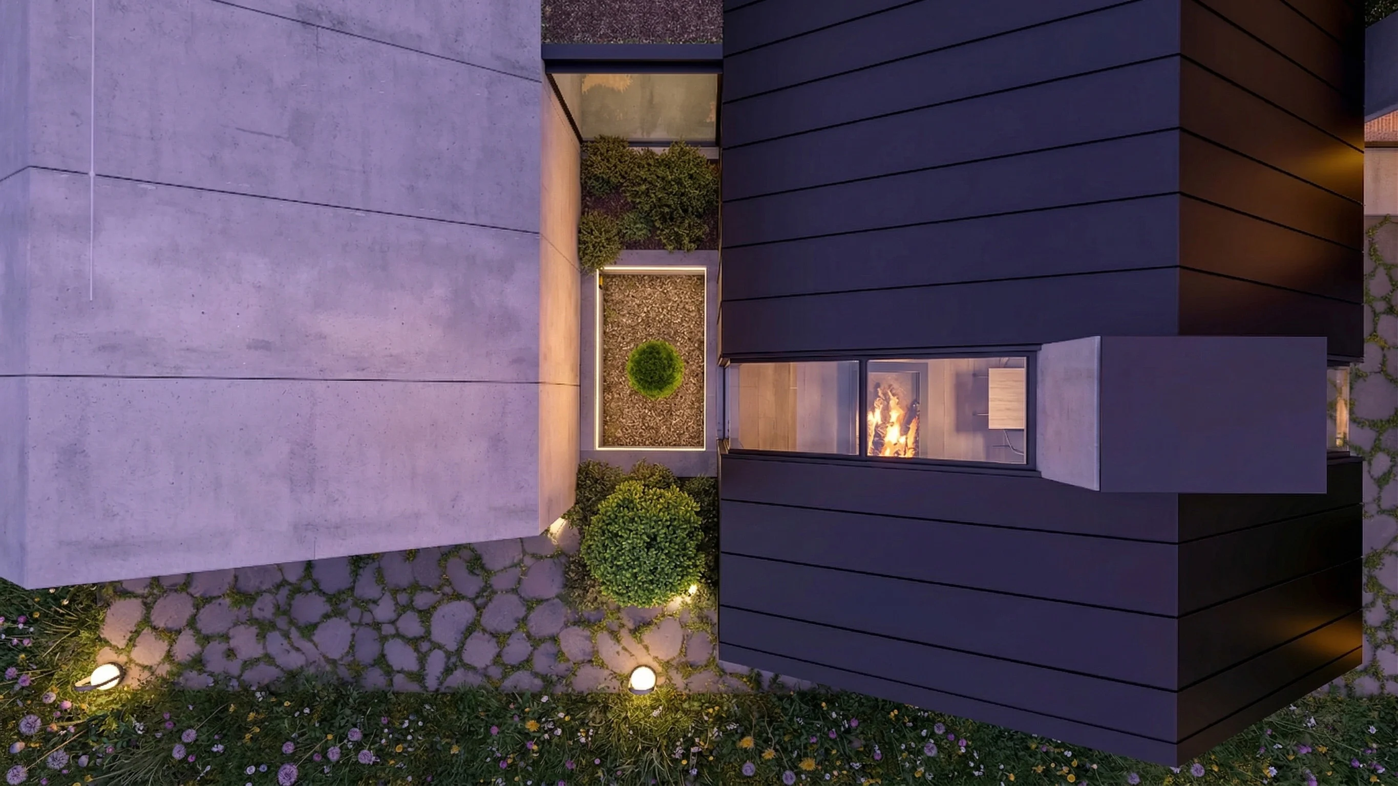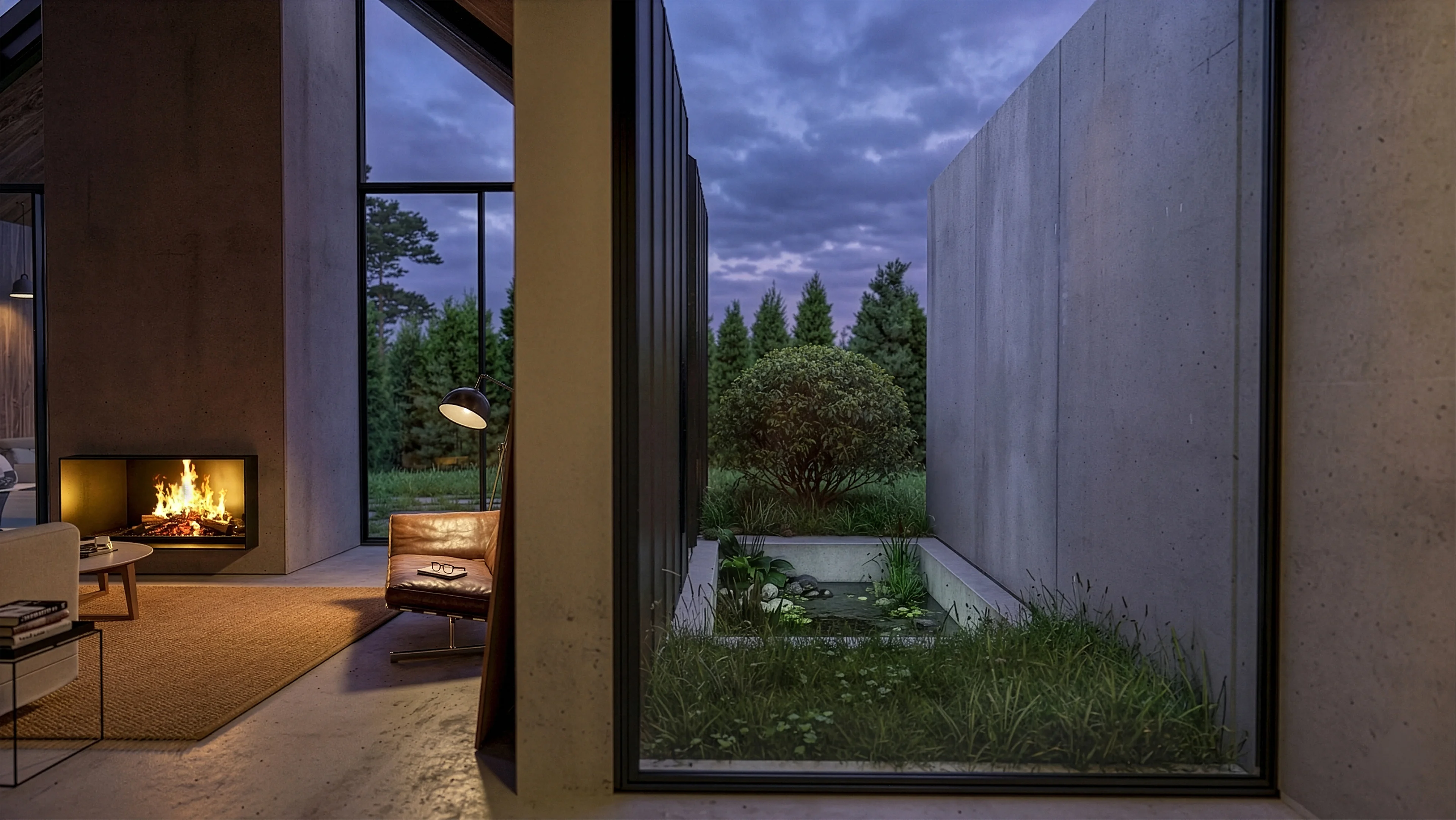 A implantação adapta-se à topografia existente, integrando áreas técnicas e estacionamento na cota inferior e libertando o piso principal para a vivência social voltada ao jardim, com continuidade entre sala, alpendre e relvado. A expressão arquitectónica resulta do diálogo entre betão aparente, madeira e amplos planos envidraçados: o betão confere massa e protecção; a madeira introduz textura e conforto; os envidraçados maximizam a entrada de luz natural, particularmente relevante numa zona onde a nebulosidade é frequente.