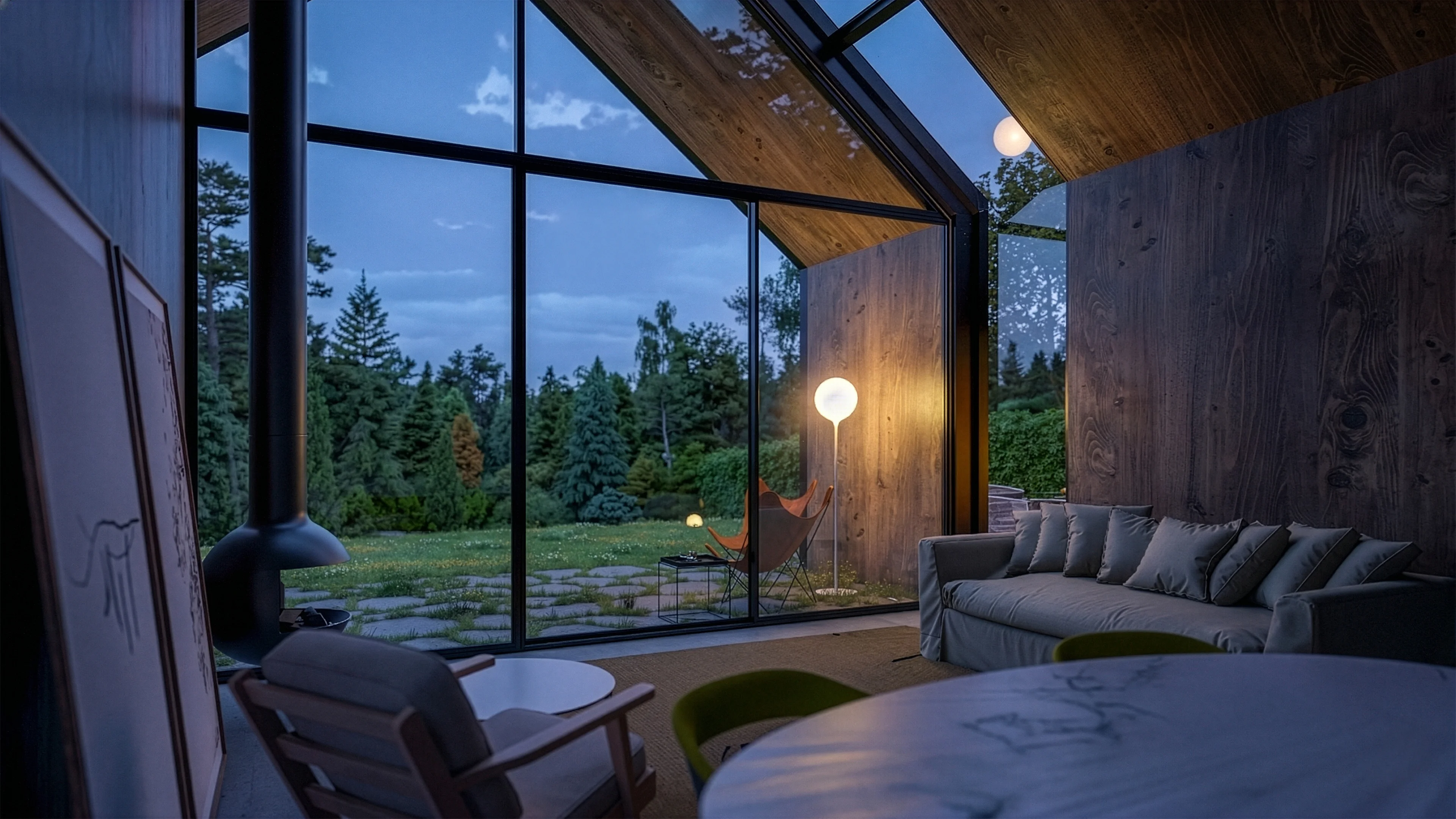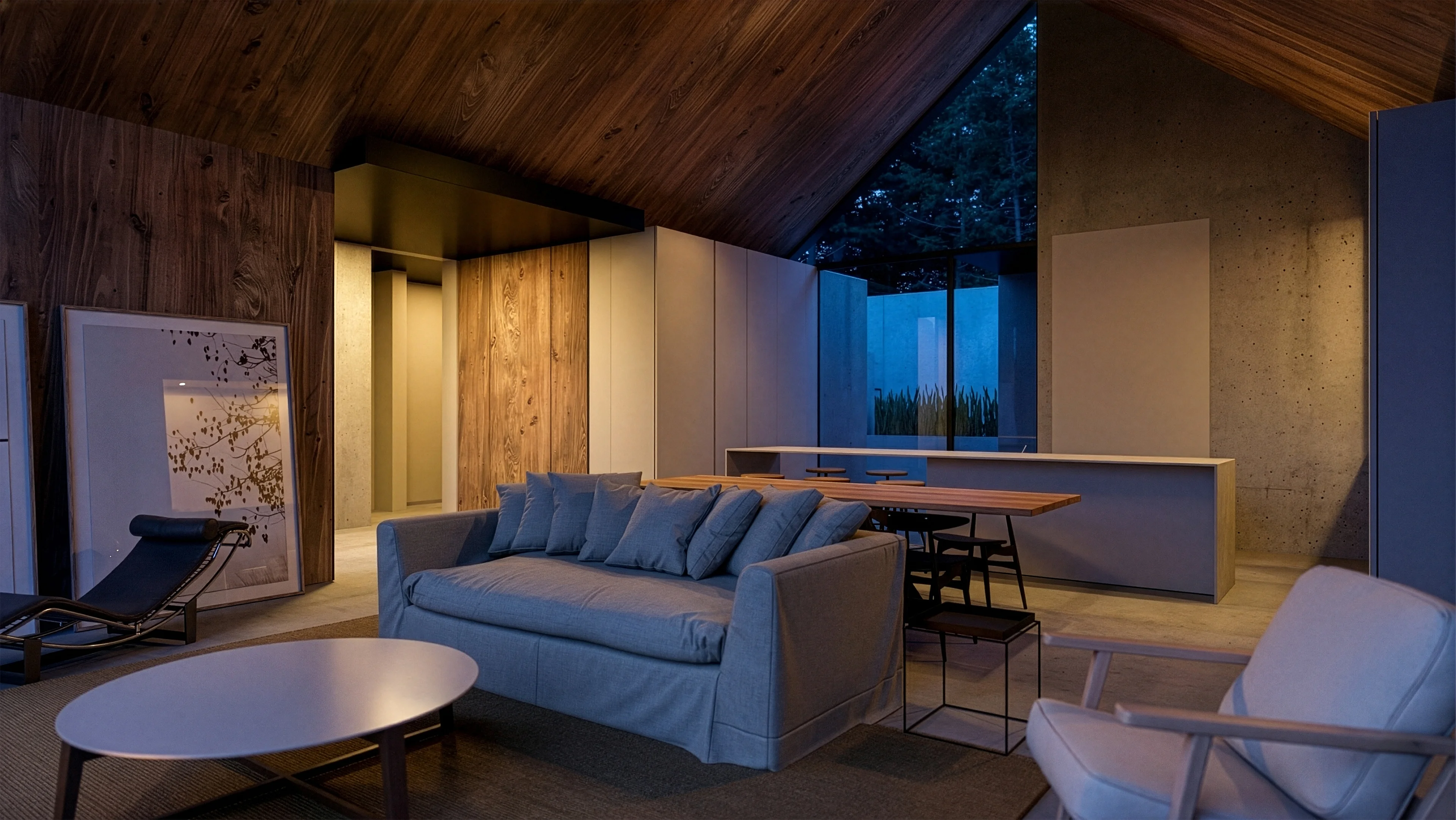 No interior, a linguagem é contemporânea e depurada, com continuidade de materiais e madeira aplicada nas superfícies inclinadas, prolongando a geometria da cobertura e criando ambientes mais acolhedores.