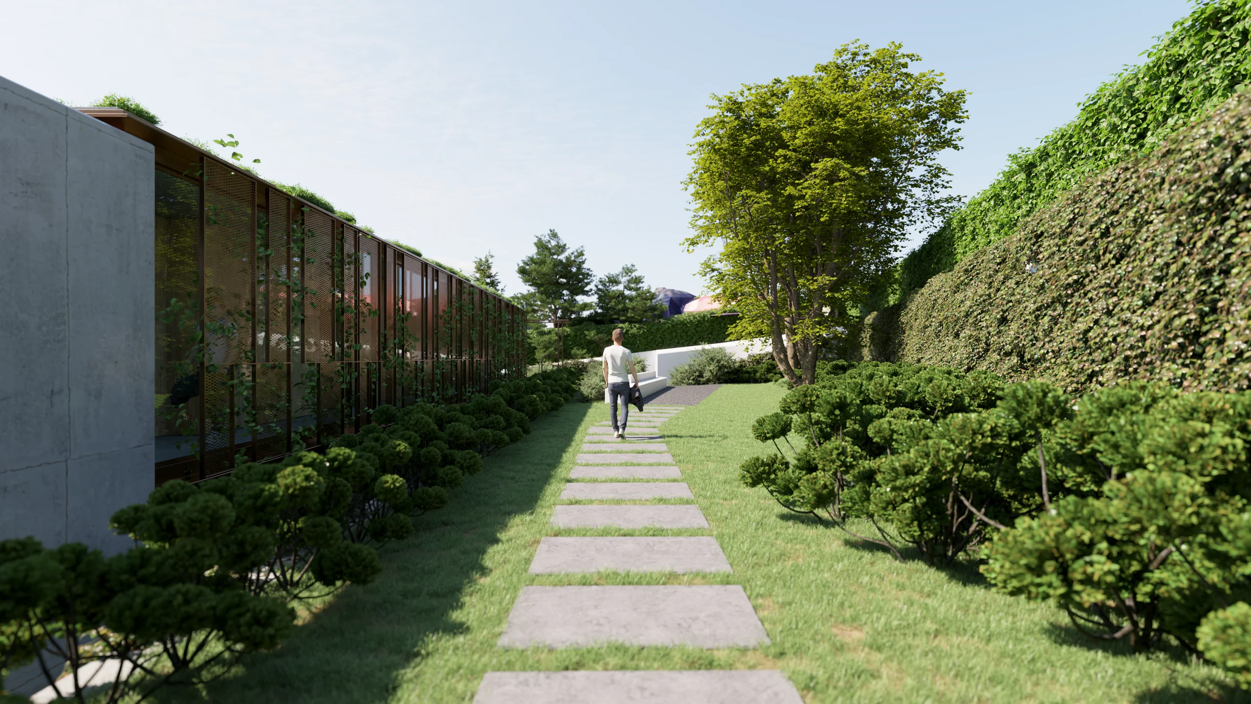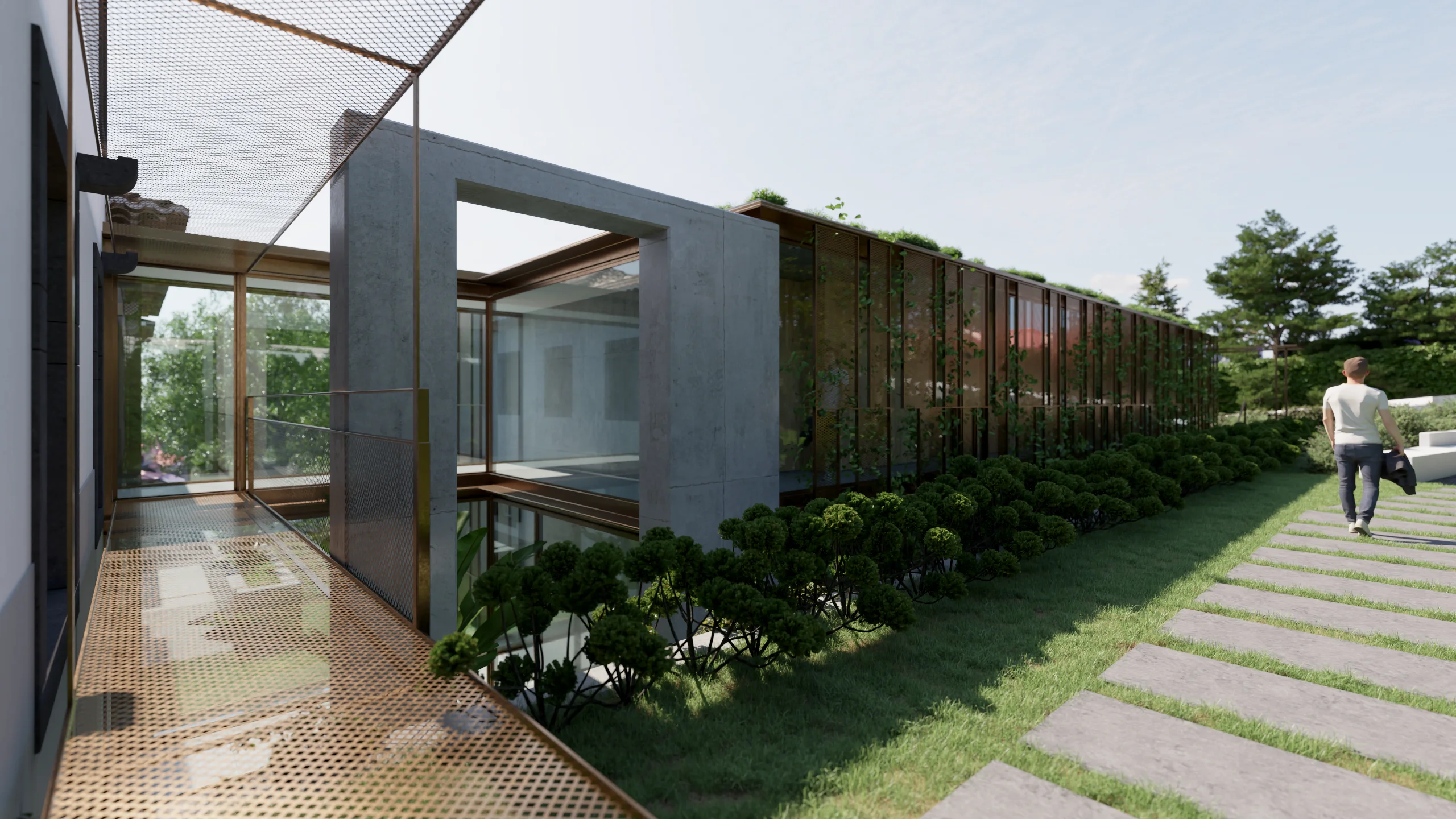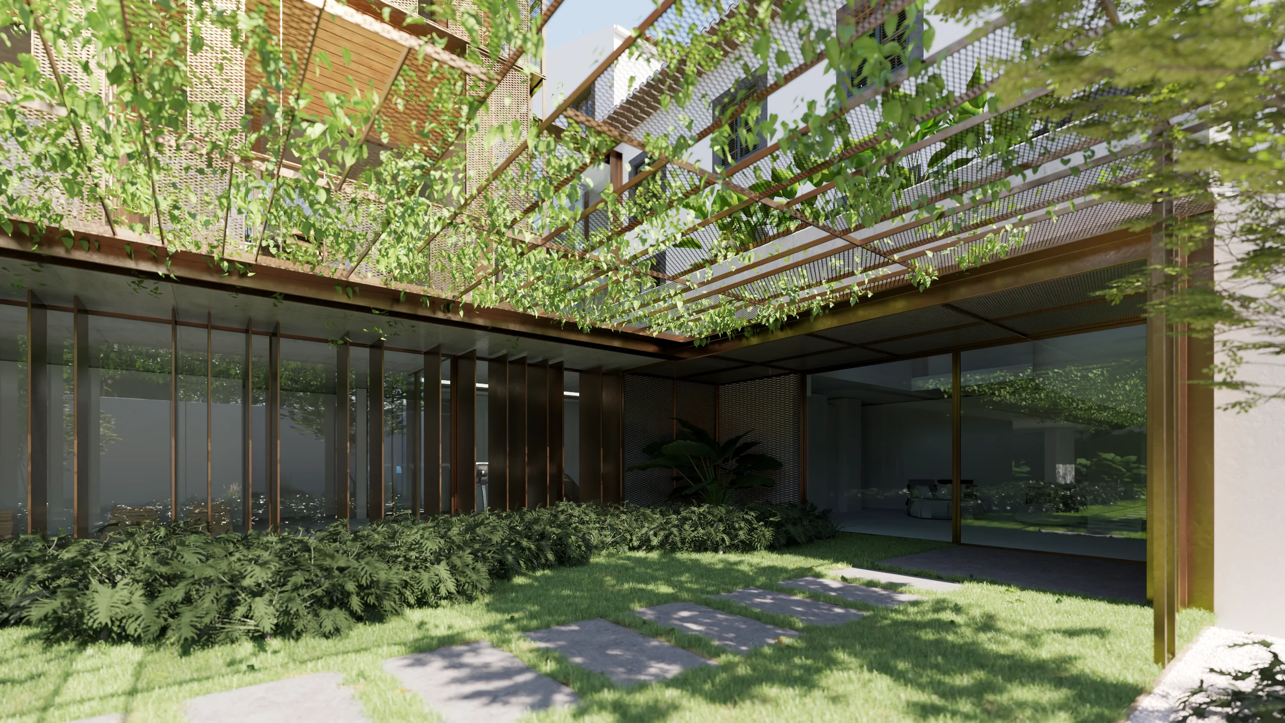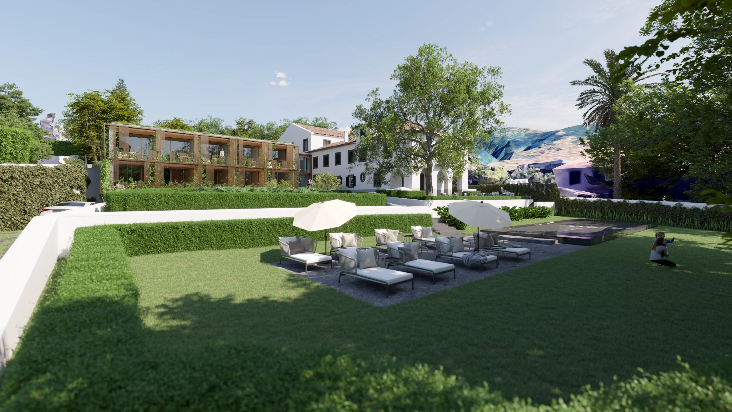 Entre a casa-mãe e o antigo armazém, um pátio interior funciona como elemento articulador, assegurando iluminação, ventilação e relação directa com o jardim. A nova construção desenvolve-se a partir de uma cota inferior, com linguagem contemporânea e contida: a volumetria acompanha a topografia e integra-se na estrutura verde da quinta, reduzindo o impacto visual quando observada das cotas superiores. A cobertura ajardinada prolonga o plano natural do jardim e reforça a continuidade paisagística.